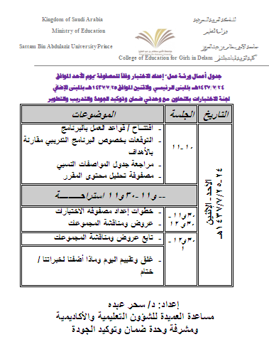 نظمت لجنة الاختبارات بالتعاون مع وحدتي ضمان وتوكيد الجودة والتدريب والتطوير ورشة عمل بعنوان " إعداد الاختبار وفقاً للمصفوفة "من إعداد وتقديم: د/ سحر عبده مساعدة العميدة للشؤون التعليمية والأكاديمية ومشرفة وحدة ضمان توكيد الجودة ، يومي الأحد و الاثنين الموافق 24-1437/7/25هـ ، بحضور عدد من أعضاء هيئة التدريس وعدد من منسقات الجودة بالأقسام و مشرفات الأقسام بالمبنى الرئيسي و بالمبنى الإضافي .