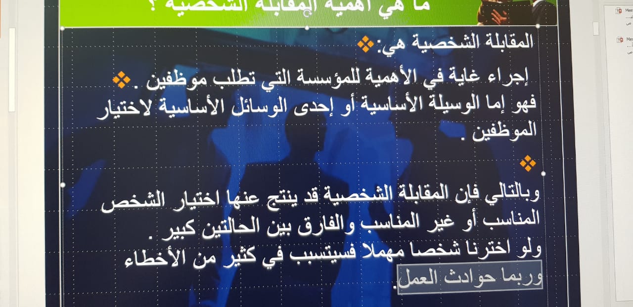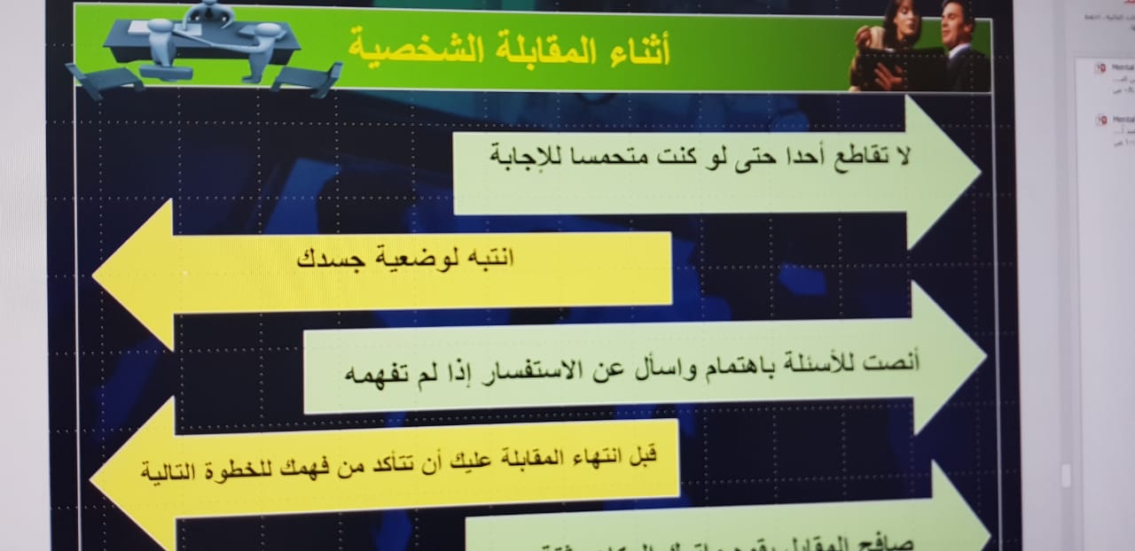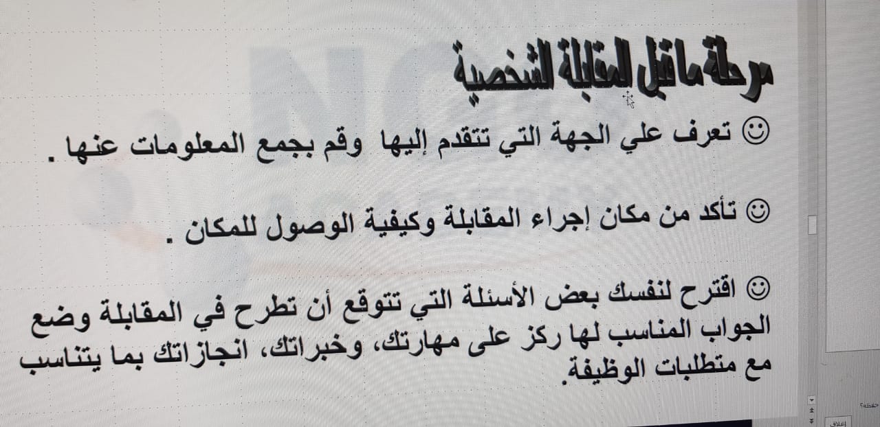 نظمت وحدة الخريجات بكلية العلوم الطبية التطبيقية بوادي الدواسر ممثلة فى لجنة التأهيل الوظيفي يوم الخميس الموافق ٢٠/٦/٢٠٢٠ ورشة عمل بعنوان ( اجتياز المقابلة الشخصية) بقاعة دراسية بالكلية ،قدمتها الدكتورة ماجدة محمود الجميل مساعدة العميد لشئون الطالبات تحدثت فيها عن كيفية الاستعداد للمقابلة الشخصية وأهميتها ومايجب فعله قبل وأثناء وبعد الانتهاء من المقابلة.وحضرها عدد من الطالبات وحضرتها الدكتورة مجيدة عبدالعاطي سليمان مشرفة وحدة الخريجات بالكلية .ولقت الورشة استحسان من الجميع.