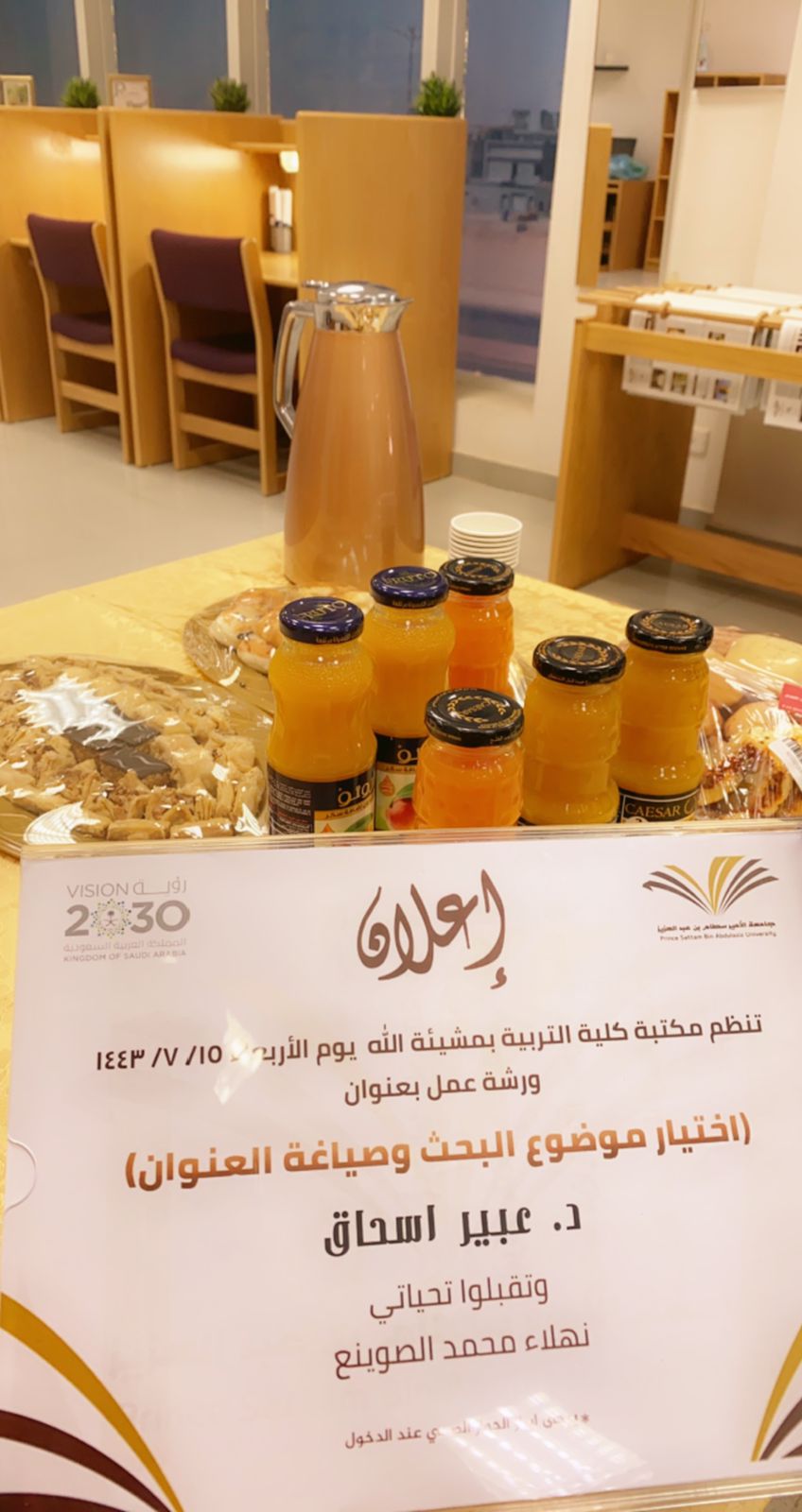 نظمت مكتبة كلية التربية في يوم الأربعاء الموافق 15-7-1443هـ ورشة عـمـل بـعنوان:(اختيار موضوع البحث وصياغة العنوان - قسم اللغة العربية شعبة 1505 - مقرر مشروع البحث 4809 عرب) للدكتورة/عبير اسحق.تم من خلالها عرض مجموعة من العناوين البحثية، وبيان أهمية العنوان، أيضا كيفية صياغة العنوان ليكون مرتبطاً ارتباطاً وثيقاً بموضوع البحث، ومعرفة شروط صياغة العنوان في البحث العلمي .وتضمنت الورشة عدة نتائج كتحليل مجموعة من العناوين البحثية ومنها على سبيل المثال (التكرار في شعر الخنساء – المكان في الشعر الأندلسي – التناص في الشعر الأموي – العروبة في شعر أبي تمام )،ومساعدة الطالبة في الوصول إلى مشروعات بحثية واستنهاض همم الطالبات للبحث والاستكشاف .