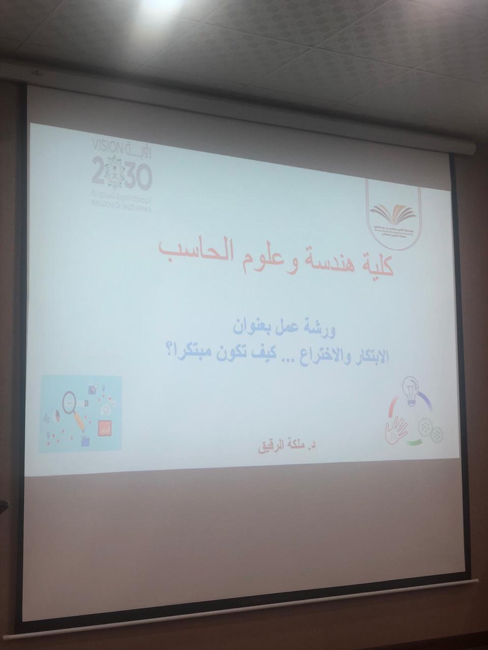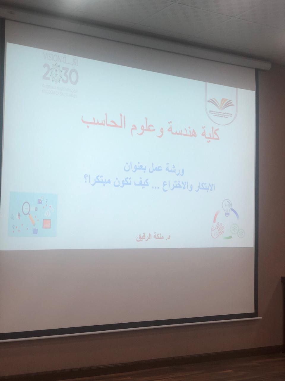 نظمت وحدة العمل الطلابي للملتقى العلمي الطلابي بكلية هندسة وعلوم الحاسب ورشة عمل بعنوان " الابتكار و الاختراع .. كيف تكون مبتكرا ؟" قدمتها د. ملكة الرقيق يوم الأحد الموافق 6-7-1441هـ في مسرح الكلية من الساعة 12 م الى 1 م .
