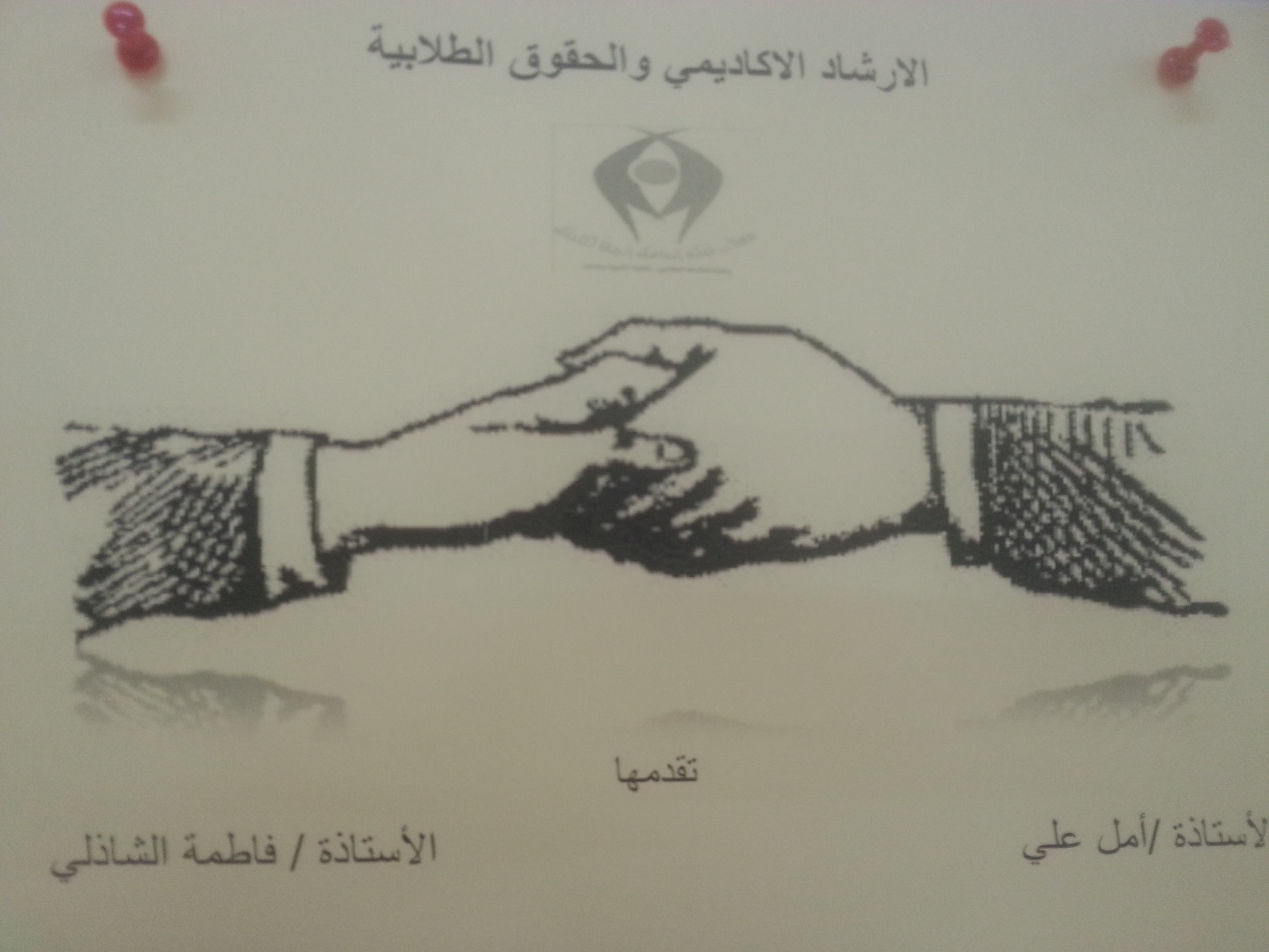 نظمت لجنة الإرشاد الأكاديمي بكلية التربية بالدلم ،بالتعاون مع لجنة النشاط الطلابي يوم الخميس 13/1/1436هـ ورشة عمل بعنوان: (الحقوق الطلابية) من إعداد وتقديم: الأستاذة: أمل علي مشرفة لجنة الإرشاد الأكاديمي، و الأستاذة فاطمة الشاذلي، بدأت بعرض فيديو ارشادي يحكي قصة طالبة مستجدة مع المرشدة الأكاديمية في جامعتها. هدفت الورشة إلى تعريف الطالبات بشكل عام و الطالبات المستجدات بشكل خاص بدور الإرشاد الأكاديمي وأهميته في حماية الطالبات من التعثر الأكاديمي ، والتأكيد على استعداد المرشدة الأكاديمية لمساعدة الطالبة حال وقوعها في مشكلة، وتخصيص جدول محاضرات إضافية (تقوية) لمن ترغب في ذلك، و استعدادها أيضا لدعم الطالبات المتفوقات والمتميزات وتنظيم برنامج لتكريم الطالبات المتفوقات نهاية كل مستوى, تخلل المحاضرة توجيهات عامة حول السلوكيات العامة التي يجب أن تتحلى بها الطالبة الجامعية .وقد لاقت المحاضرة تفاعل كبير من الطالبات وجهن فيها بعض الأسئلة والاستفسارات.