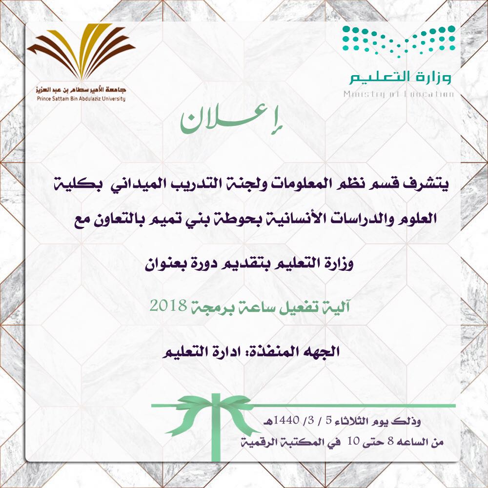 نظمت لجنة التدريب الميداني بقسم نظم المعلومات بكلية العلوم والدراسات الإنسانية بحوطة بن تميم بالتعاوم مع وزارة التعليم ورشة عمل ( آلية تفعيل ساعة برمجة) يوم الثلاثاء 5/3/ 1440 هـ عند الساعة الثامنة صباحاً بالمكتبة الرقمية. رحبت فيها الدكتورة حنان الدليهم مديرة قسم التدريب التربوي بحوطة بني تميم بطالبات النظم المستوى السابع وأعربت عن سعادتها بالشراكة بين مؤسسات وزارة التعليم في سبيل تفعيل ساعة برمجة 2018 الأستاذة أشواق ابراهيم التميمي منسقة ساعة البرمجة بحوطة بني تميم. تطرقت الأستاذة أشواق خلال الورشة للمحاور التالية: