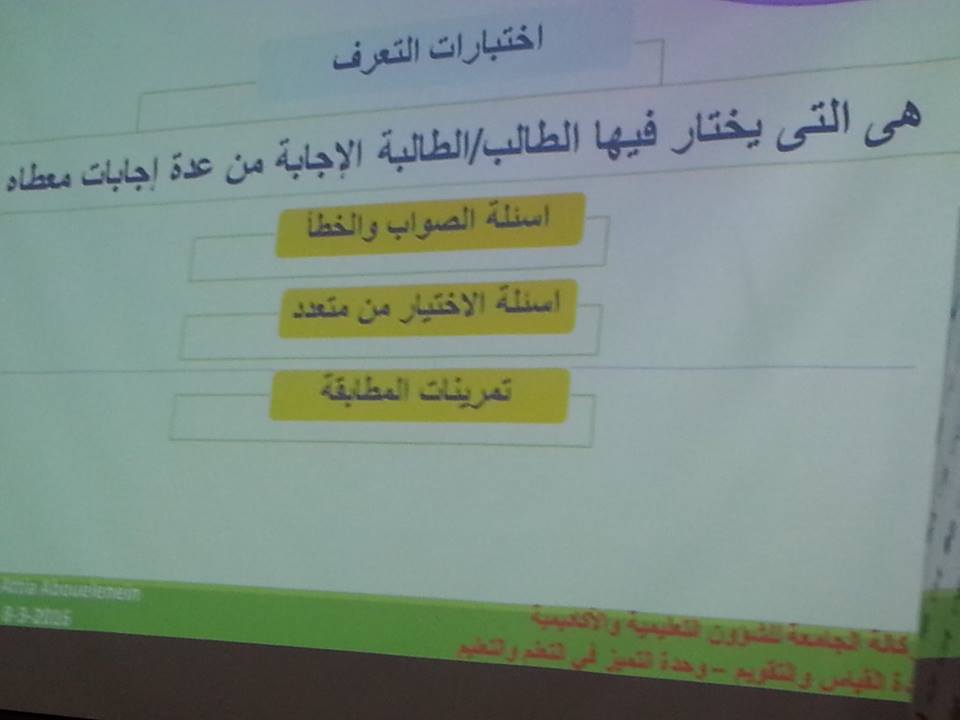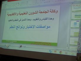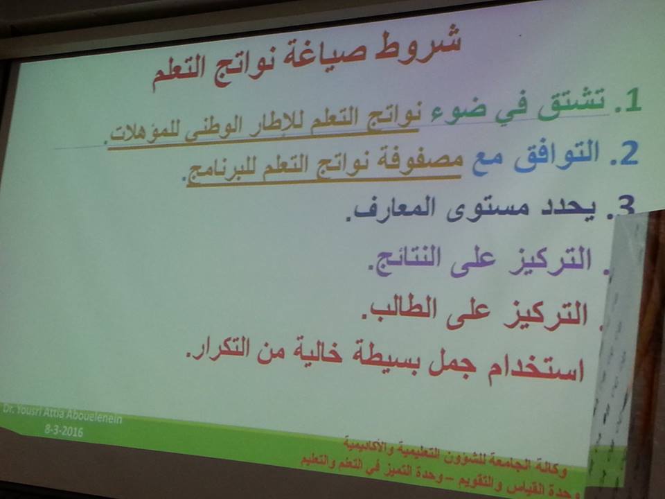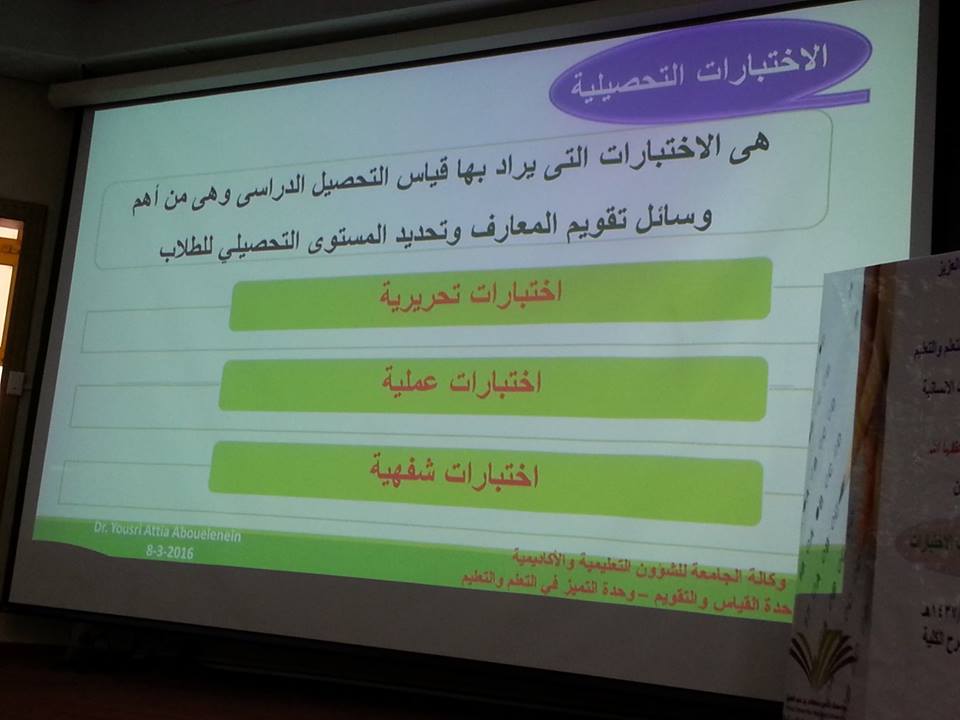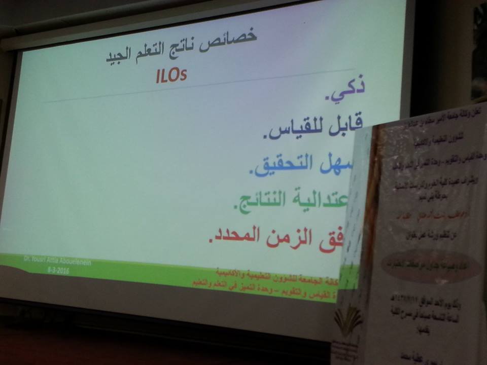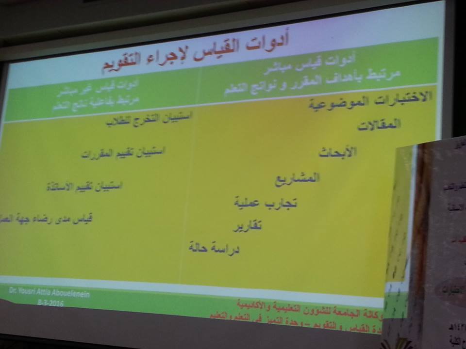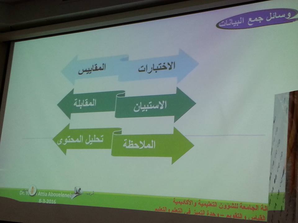 تناولت الورشة وسائل جمع البيانات بالاختبار والمقاييس ، ثم تحدث عن الاختبارات التحصيلية ، وأنواعها ومميزات وعيوب كل نوع منها ، تناول بالعرض مواصفات الاختبارات وخطوات إعداد الاختبار الجيد ، ونواتج التعلم وخصائص التعلم الجيد وشروط صياغتها ، ثم وضح الاطار الوطني للمؤهلات واستخدامها في مصفوفة المقررات الأساسية ، ثم أختمت الورشة بالحديث عن التقويم وأدوات القياس لأجراء التقويم، وقد تخلل الورشة العديد من المناقشات والحوارات والاسئلة التي تم طرحها أعضاء وعضوات هيئة التدريس وتم الإجابة عليها.