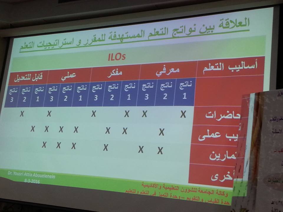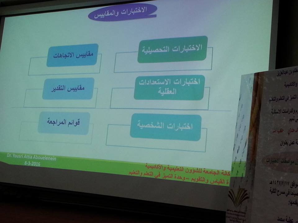أقامت وكالة جامعة الأمير سطام بن عبد العزيز للشؤون التعليمية والأكاديمية ، وحدة القياس والتقويم – وحدة التميز في التعلم والتعليم – بكلية العلوم والدراسات الإنسانية بحوطة بني تميم ورشة عمل بعنوان إعداد وصياغة جدول مواصفات الاختبارات قدم الورشة د. يسري عطية محمد ، وحضرت الورشة عميدة الكلية أ . د عواطف بنت أحمد هندي، ووكيلة الكلية د. حصة الهزاني وعضوات هيئة التدريس من الشطر النسائي وأعضاء هيئة التدريس من الشطر الرجالي