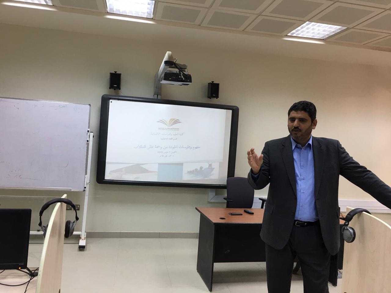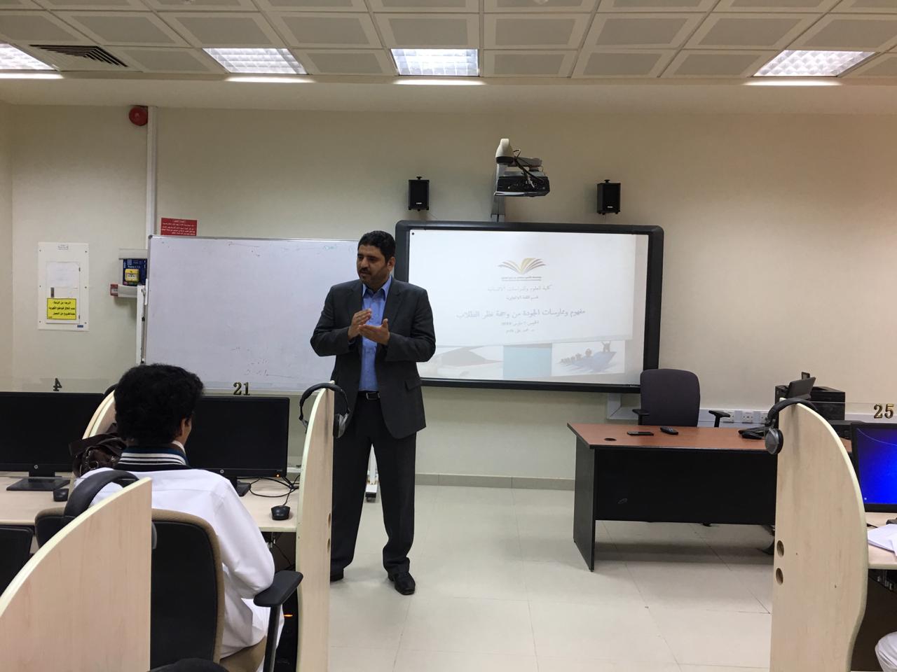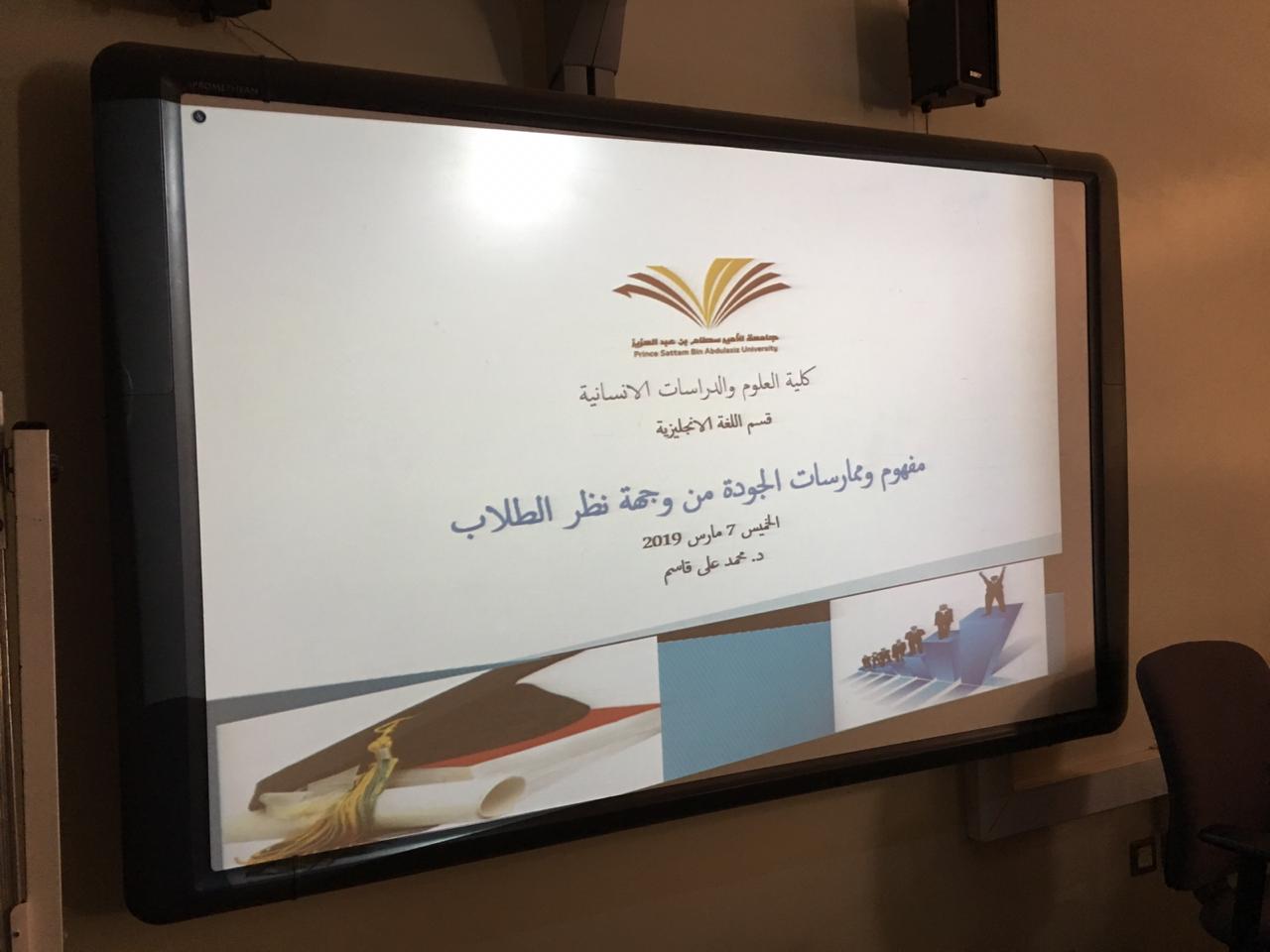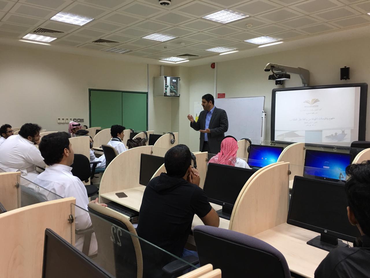 ورشة عمل بعنوان "إدارة الجودة للطلاب" بكلية العلوم والدراسات الانسانية بالخرج تحت رعاية سعادة عميد كلية العلوم والدراسات الإنسانية، نظَّمت وحدة التدريب والإرشاد الأكاديمي بالكلية ورشة تدريبية لطلابها ومنسوبيها بعنوان "ادارة الجودة للطلاب" Quality Management for Students، وقام بتقديمها مشكوراً سعادة الدكتور/ محمد قاسم، الأستاذ المساعد بقسم اللغة الإنجليزية فى يوم الخميس 7/3/2019 م. وهدفت هذه الورشة التوعوية لتثقيف وتوعيتهم بمفاهيم ومتطلبات الجودة والاعتماد حرصاً من الكلية على نشر ثقافتهما بين منسوبيها. وتنبع فاعلية هذه الورشة كونها تحرص على تأكيد أهمية وقيمة الجودة والاعتماد على المستويين المحلى والدولي، حيث ركزت على ثقافة الجودة وربطها برؤية المملكة 2030م، وتمركزت محاورها حول فلسفة الجودة ومبادئها الأساسية وطرق تحقيقها وتطبيقها ومعايير المحافظة عليها قولاً وعملاً فالجودة عملية مستدامة ليس لها نهاية. هذا وقد أقبل على حضور هذه الدورة جمع غفير من طلاب ومنسوبي الكلية إيماناً منهم بقيمة الجودة في تحقيق رؤية المملكة 2030 القائمة على ترسيخ وتطبيق ثقافة الجودة في الأداء والممارسات رفعاً للانتاجية وتحقيقاً للتنافسية ولحاقاً بركب الدول المتقدمة، وقد غلب على هذه الدورة طابع الحوار وتبادل الأفكار.