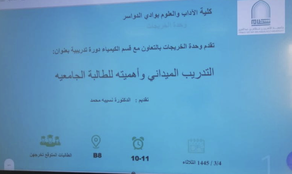 تم تقديم الورشة بكلية الآداب والعلوم بوادي الدواسر بشطر الطالبات بحضور عدد من الطالبات ، وكان التفاعل أثناء العرض بين الطالبات ومقدمة الورشة لأهمية الموضوع بالنسبة للطالبات وتعريفهن بالمهارات المكتسبة من خلال التدريب الميداني.
