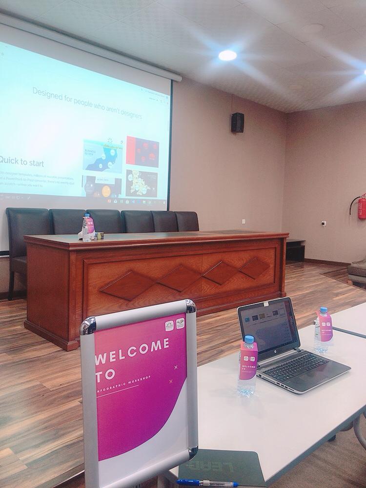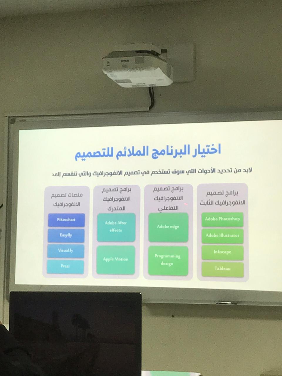 بالتعاون مع مبادرة العطاء الرقمي نظّم المجلس الطلابي بكلية هندسة وعلوم الحاسب (قسم الطالبات ) ورشة عمل بعنوان "الإنفوجرافيك" يوم الخميس الموافق ١٤٤١/٤/١ من الساعة ٦ وحتى ٩ مساءً بحضور ٥٢ متدربة في مسرح الكلية؛ حيث تناولت الورشة شرحاً لمفهوم الإنفوجرافيك وأنواعه ومحتوياته وبعض المواقع المفيدة لمحتوى الإنفوجرافيك وتصميمه، بعد ذلك تم التطبيق وتدريب الحضور عملياً على تصميم الإنفوجرافيك.