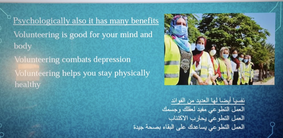تم توعية الطالبات بالأنواع المختلفة من الخدمات التطوعية التي يمكن أن يشاركن فيها ، كما تم اطلاعهم على بعض المنظمات التي تعمل وتنفذ هذه الخدمات.