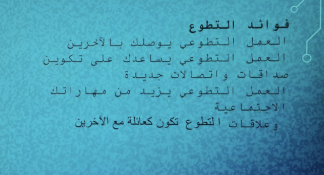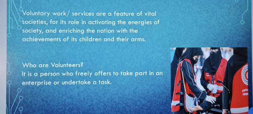 كانت الفكرة الأساسية للعرض التقديمي هي أن ا الطالبات يفهمن أنواع الخدمات التطوعية ومعرفة مدى فائدتها وأهميتها لبناء المجتمع