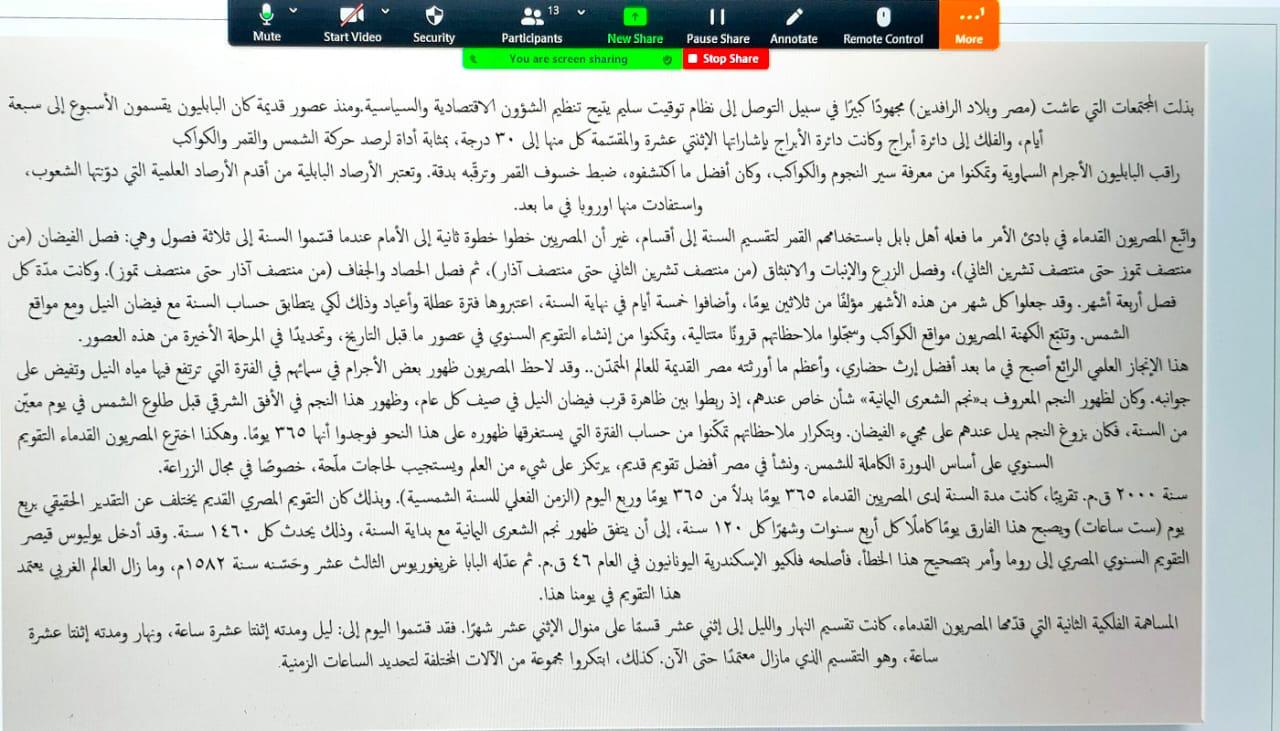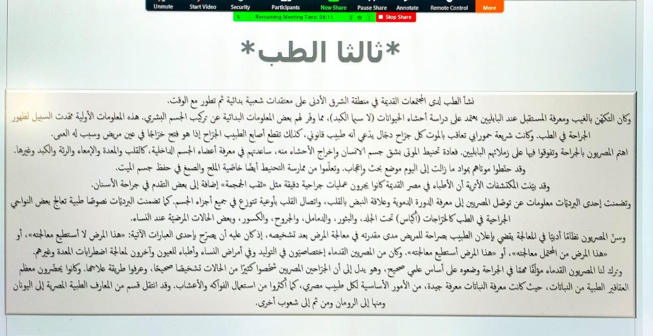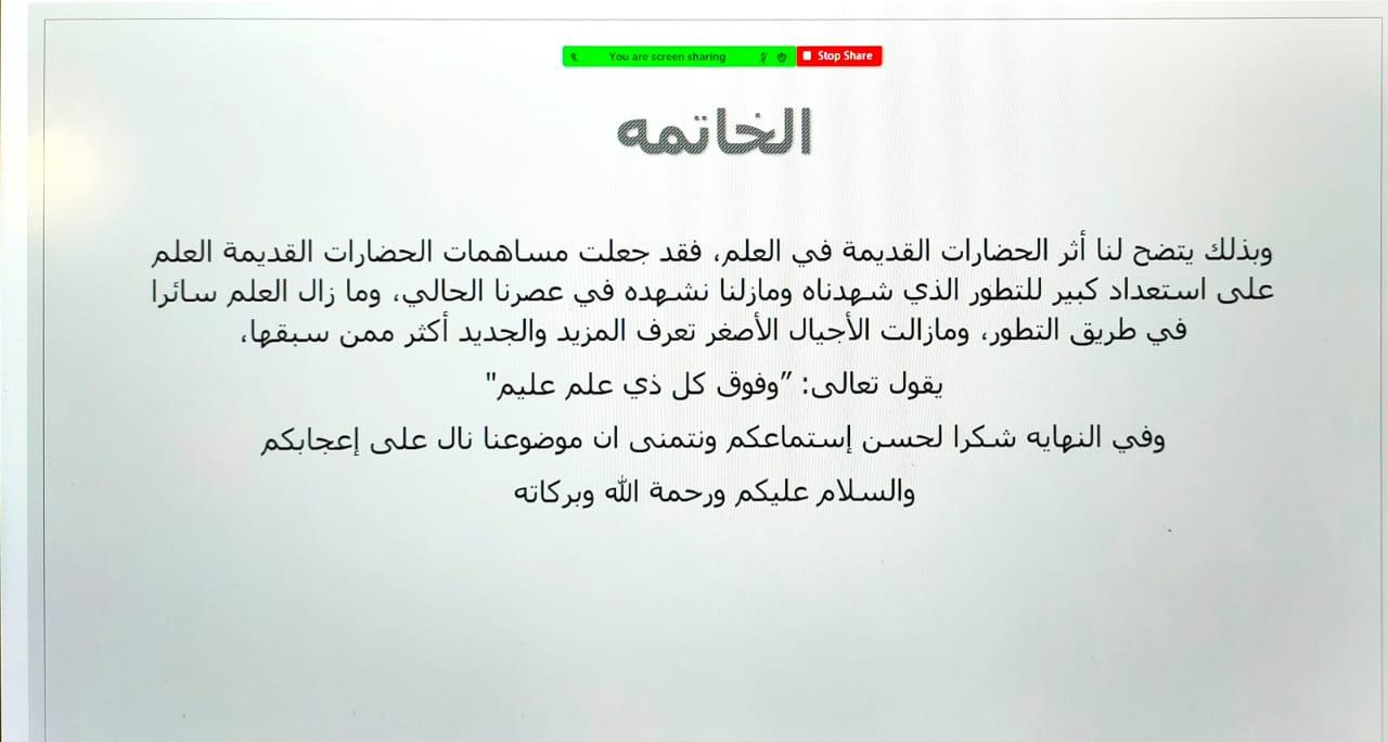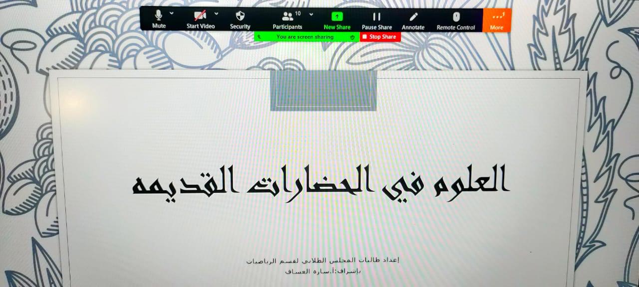 قدمّت شعبة المجالس الطلابية بوحدة العمل الطلابي ممثلة بالمجلس الطلابي لقسم الرياضيات في كلية العلوم والدراسات الإنسانية في الخرج (أقسام الطالبات) ورشة عمل بعنوان (العلوم في الحضارات القديمة) من تقديم الطالبات/ عائشة هزازي وفتون الغامدي ورهف العنزي بإشراف الاستاذة ساره العساف وذلك يوم الأحد الموافق 1/8/1442هـ وذلك عبر جلسة افتراضية على برنامج الزوم وذلك في تمام الساعة 7 مساء ًا.
