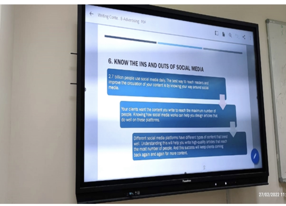أقامت كلية الآداب والعلوم بوادي الدواسر(شطر الطالبات )ورشة عمل بعنوان (المحتوى الإلكتروني أو الرقمي لتصميم الإعلانات الإلكترونية) قدمتها الدكتورةعتيقة بانو ، قسم اللغة الإنجليزية التابع لوحدة التطوير والتميز في 27 فبراير 2022 الساعة 11 صباحًا . استهدفت الورشة مجموعة من الطالبات و أعضاء هيئة تدريس حيت تهدف إلى توعية الجمهور بمفهوم الإعلان وكيفية كتابة المحتوى للإعلان والإعلان الإلكتروني وتوعيتهم بالضرورات والقواعد التي يجب إتباعها قبل إعداد أي محتوى. وقد نجحت ورشة العمل في توضيح فكرة الإعلان وكيفية كتابة المحتوى لغرض معين وركزت على أهمية الأصالة في الكتابة وخصوصيات وعموم وسائل التواصل الاجتماعي التي تحفز الطلاب على ممارسة مهنة في مجال كتابة المحتوى.