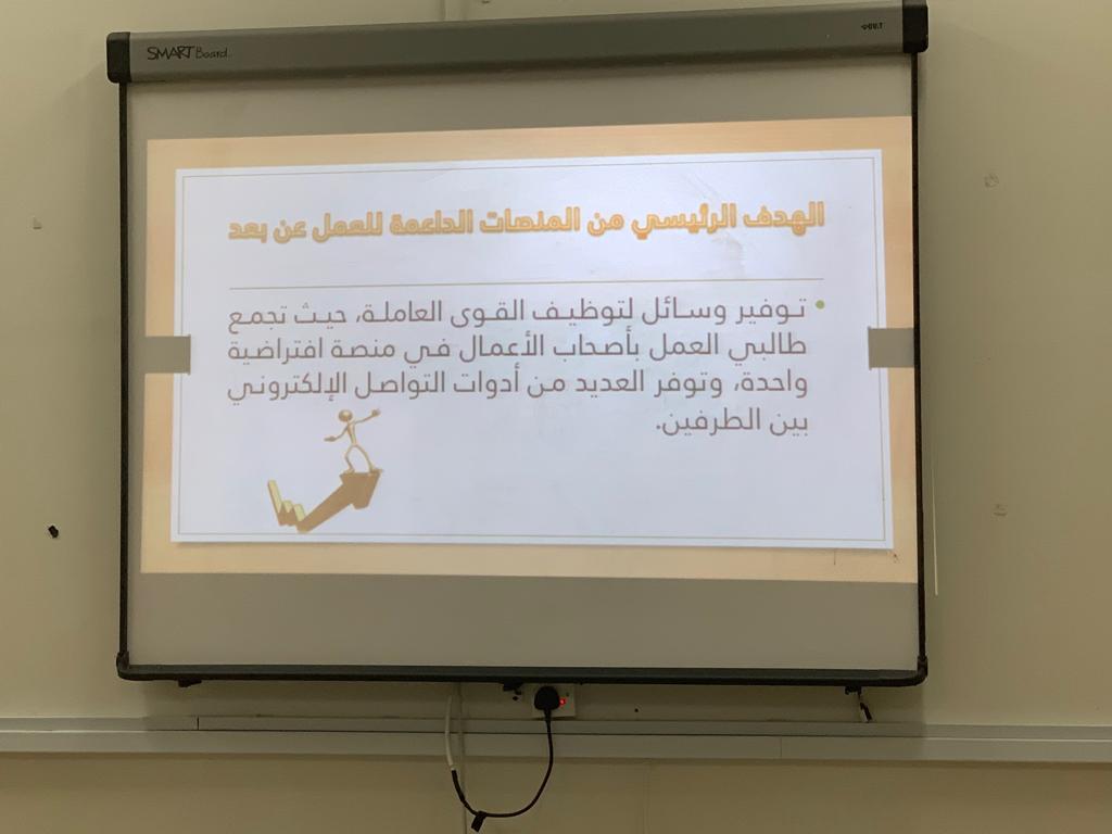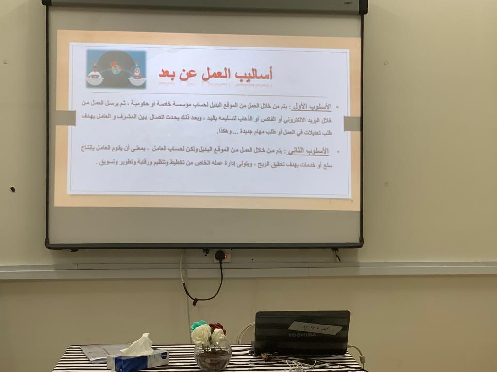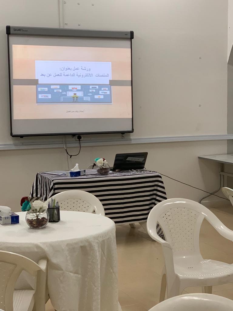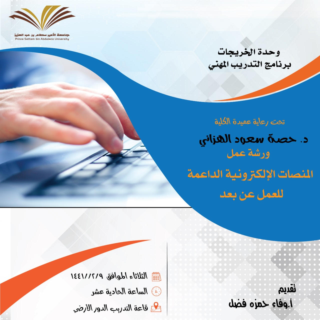 أقامت وحدة الخريجين متمثلة ببرنامج التدريب المهني بكلية العلوم والدراسات الإنسانية بحوطة بني تميم ورشة عمل بعنوان ( المنصات الإلكترونية الداعمة للعمل عن بعد ) تحت قيادة عميدة الكلية سعادة الدكتورة/ حصة بنت سعود الهزاني، وذلك يوم الثلاثاء الموافق ٩/ ٢/ ١٤٤١هـ في قاعة التدريب بالكلية، قدمتها أ. وفاء حمزة فضل المحاضر من قسم نظم المعلومات، وحضر الورشة بضعة عشر طالبة من الخريجات والمتوقع تخرجهن، حيث تعرفن على بعض المنصات ذات العمل الجماعي، بحيث تتيح لهن القدرة على الاندماج في مجتمع العمل الحر عن بعد، ومعرفة طرائق مزاولته بكل احترافية. وقد حضر الورشة عدد من الأعضاء.