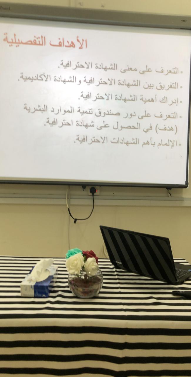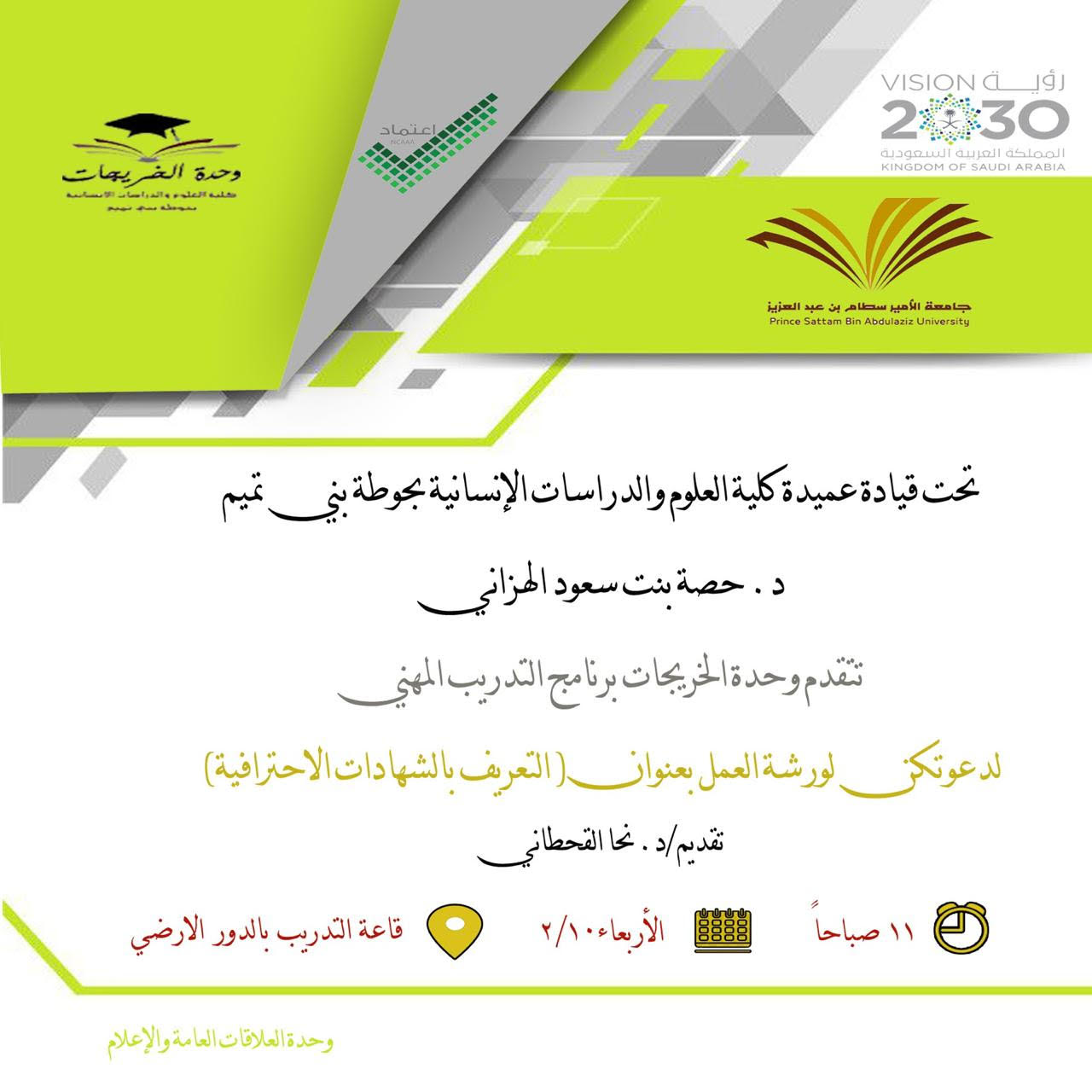 أقامت وحدة الخريجين متمثلة ببرنامج التدريب المهني بكلية العلوم والدراسات الإنسانية بحوطة بني تميم تحت قيادة عميدة الكلية سعادة الدكتورة/ حصة بنت سعود الهزاني، وذلك يوم الأربعاء الموافق ١٠/ ٢/ ١٤٤١هـ في قاعة التدريب بالكلية، وقد قدمتها الدكتورة/ نحا القحطاني، الأستاذ المساعد بقسم اللغة العربية، و حضر الورشة بضعة عشر طالبة من كل الفئات، حيث تعرفن على معنى الشهادات الاحترافية، وأهميتها، والفرق بينها وبين الشهادة الأكاديمية، وطريقة الحصول على الدعم من صندوق تنمية الموارد البشرية (هدف)، وشهدت الورشة حضور عدد من الأعضاء، وفي ختام الورشة عبرت الطالبات الحاضرات عن استحسانهن والصدى الذي تركته الورشة في أنفسهن.