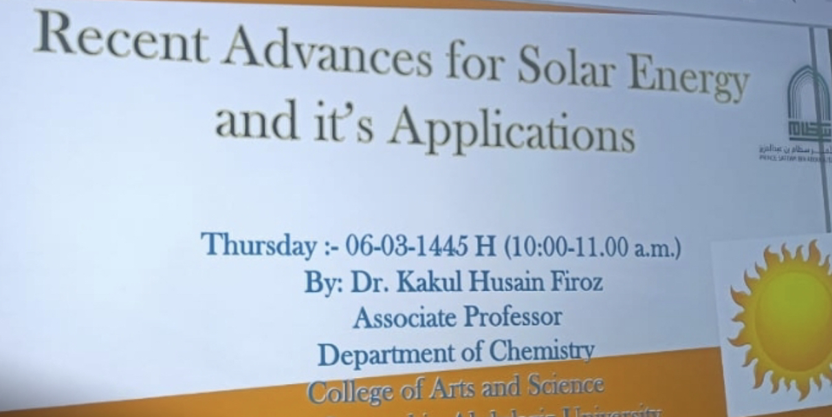 نظمت وحدة خدمة المجتمع متمثلة في المسؤولية المجتمعية بكلية الآداب والعلوم بوادي الدواسر بالتعاون مع قسم الكيمياء ورشة عمل تحت عنوان:(التطورات الحديثة للطاقة الشمسية وتطبيقاتها) قدمتها الأستاذ المشارك بقسم الكيمياء الدكتورة كاكول حسين، وذلك في يوم الخميس 6/3/1445هـ.