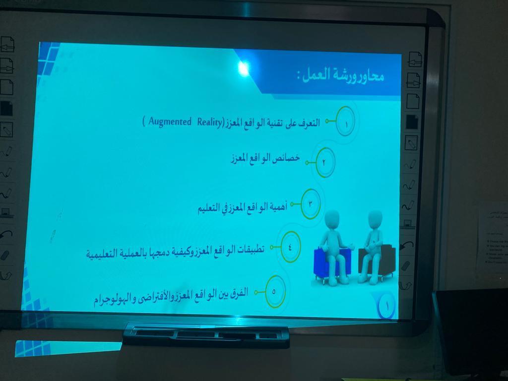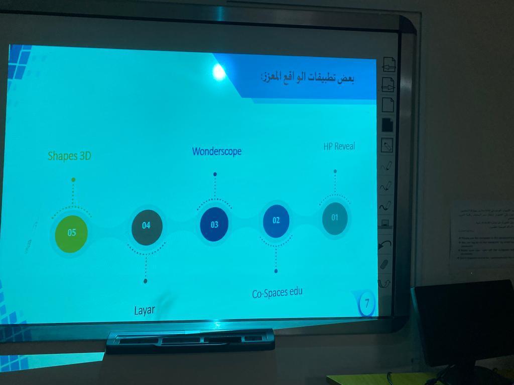 وخصائصه وأهميته بالإضافة للتعرف علي بعض التطبيقات وكيفية استخدامها لدمج التقنية في العملية التعليمية واختتمت الورشة بالتعرف عمليا علي الفرق بين الواقع المعزز والواقع الافتراضي والهولوجرام ، وأهمية توظيف تقنية الواقع المعزز في التعليم الذي يتوقف على درجة امتلاك المعلم للمعارف والمهارات اللازمة لاستخدام هذه التقنية والتعامل معها، حيث تتبنى بيئات التعلم أساليبها بناء على احتياجات المتعلمين ومتطلباتهم.