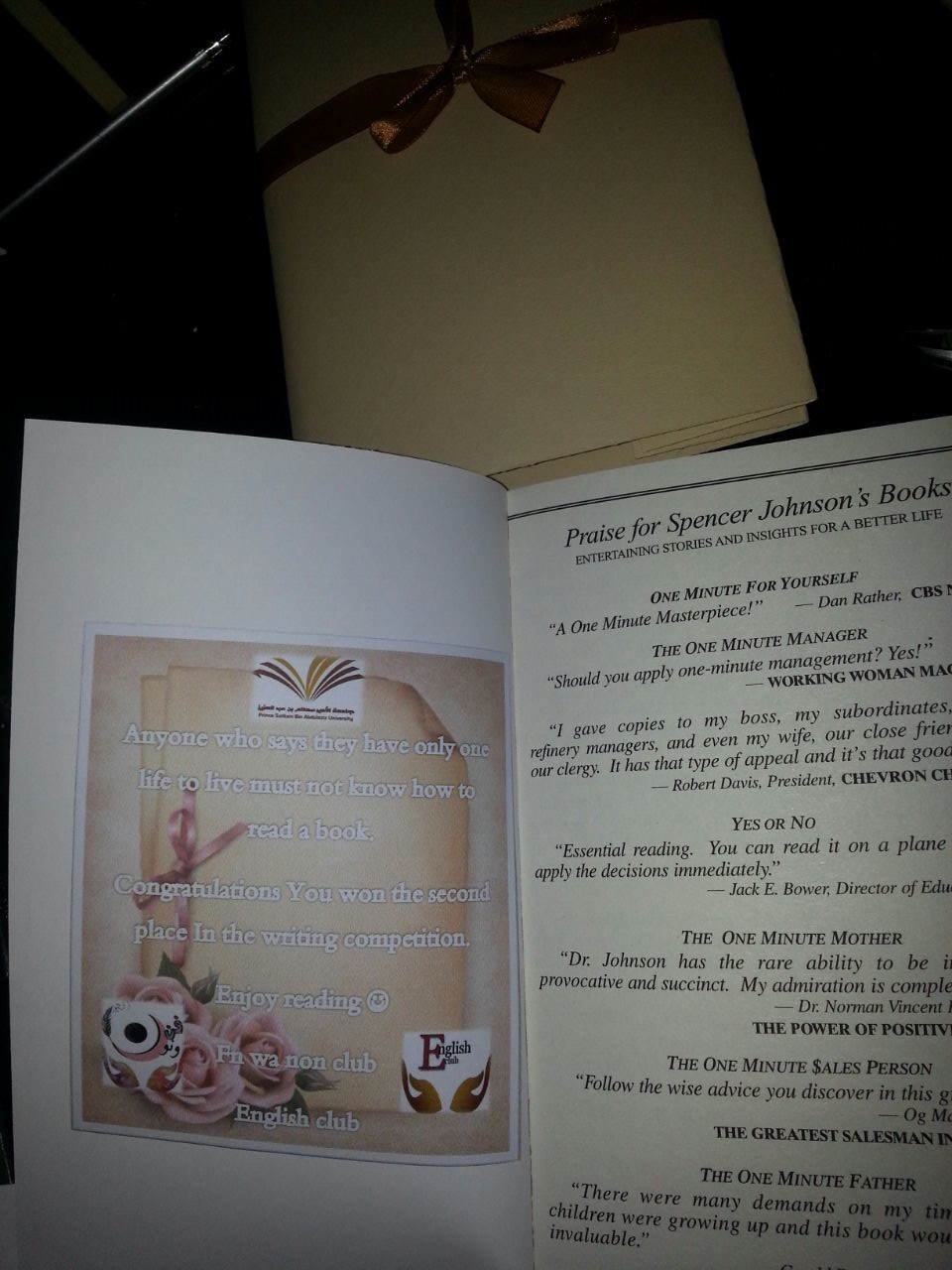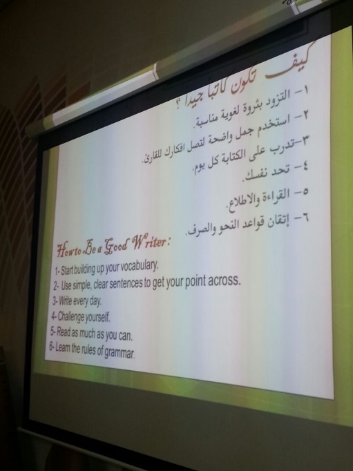 تم فيه عرض أساسيات الكتابة وصفات الكاتب الجيد وكذلك عرض لإنجاز الطالبات اليدوية بصنع فواصل للكتاب كجزء من التشجيع على الكتابة والابداع. الجيد وتم تكريم الفائزين بمسابقة القصة والشعر والمقال باللغتين العربية والانجليزية والتي تم طرحها مسبقًا من قبل الناديين كأحد أنشطة فن صناعة الحرف.
