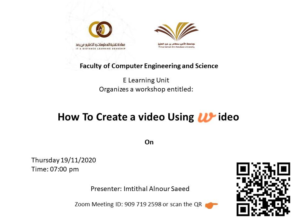 وذلك في يوم الخميس الموافق 19-11-2020 م الساعه 7 م قدمها المحاضرة /أ. أمتثال النور ، لتعريف أهمية البرنامج وطريقة وتصميم وإنشاء ملف فيديو widro باستخدام برنامج