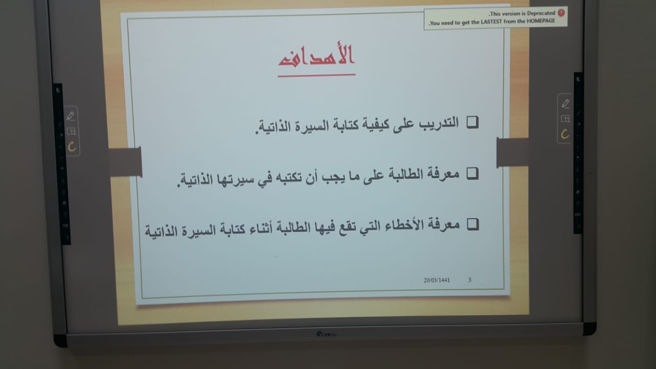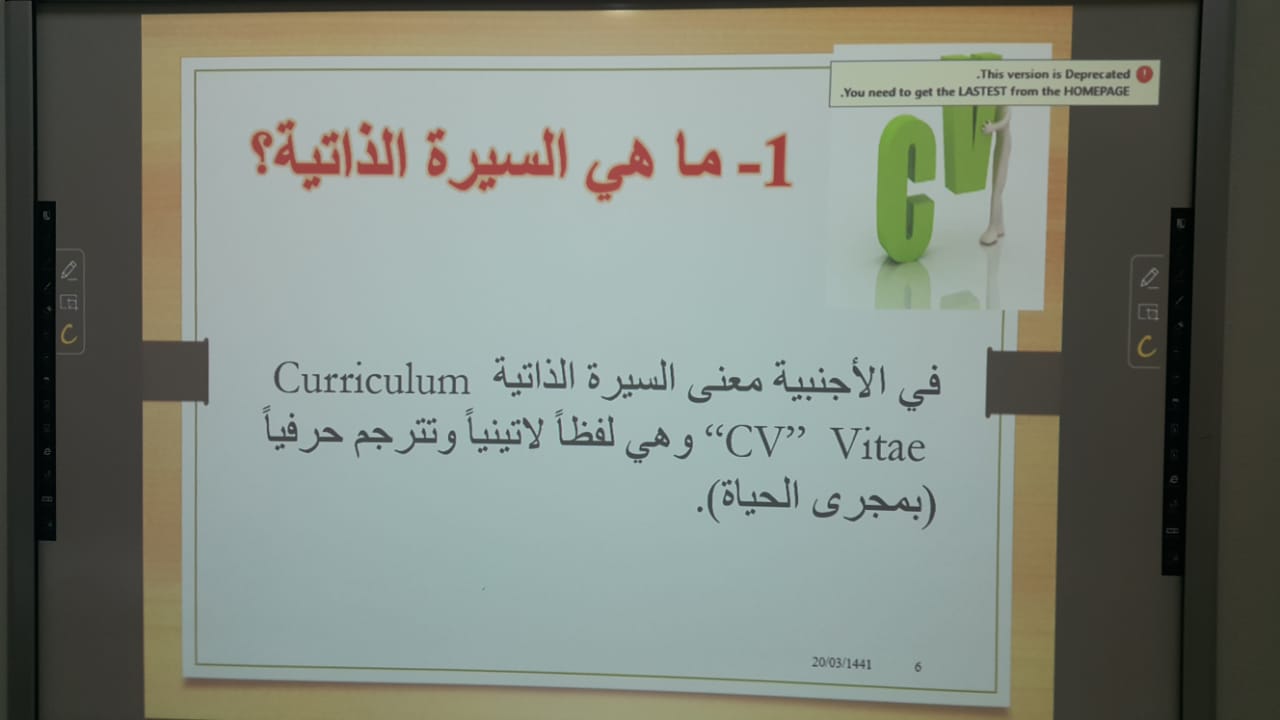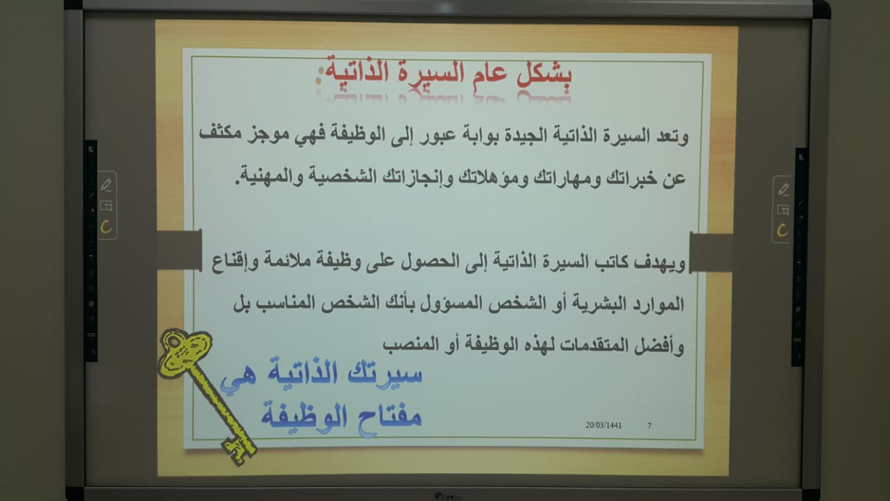 وكان الهدف العام للورشة أن تتمكن الطالبة من كتابة سيراتها الذاتية بطريقة متميزة ومن أهم النقاط التي تم تناولها في الورشة: مفهوم السيرة الذاتية، ماهي محتويات السيرة الذاتية، ماهي أهم الفنيات التي يجب مراعاتها في كتابة السيرة الذاتية، وقد تم عمل تطبيقات عملية على كيفية كتابة السيرة الذاتية، وكان الحضور من الطالبات وقد اظهرن مدى الاستفادة من الورشة وقدرن أهمية العناية بمظهر ومعلومات السيرة الذاتية.