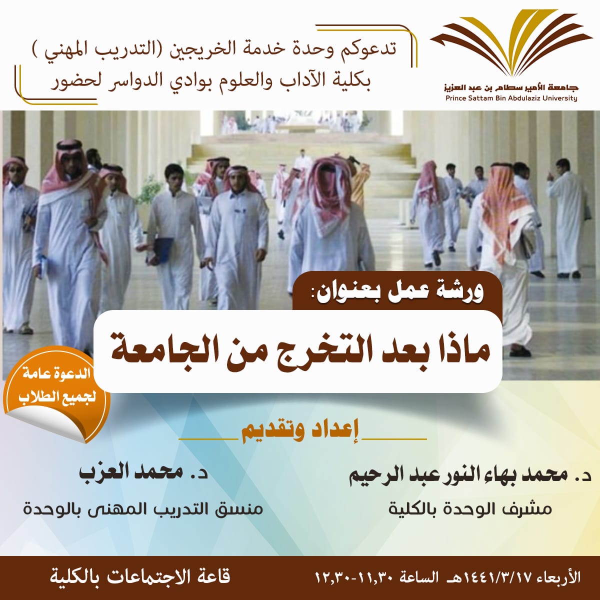 بتوجيهات ومتابعة الدكتور عمر بن نوح المطيري عميد كلية الآداب والعلوم بوادي الدواسر ، أقامت وحدة الخريجين ( التدريب المهني ) في الكلية ورشة عمل بعنوان (ماذا بعد التخرج من الجامعة ) وذلك يوم امس الأربعاء الموافق 1441/3/16هـ ، بقاعة التدريب بالكلية ، قدمها الدكتور محمد بهاء النور مشرف وحدة الخريجين بالكلية .