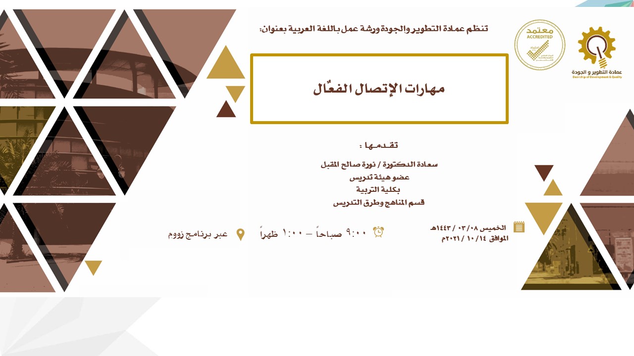 نظمت عمادة التطوير والجودة ورشة عمل بعنوان: " مهارات الاتصال الفعال " وذلك يوم الخميس 08/03/1443 هـ الموافق 14/10/2021م والتي قدمتها عضو هيئة التدريس بكلية التربية / قسم المناهج وطرق التدريس سعادة الدكتورة نوره صالح المقبل، وبحضور أكثر من (45) متدرب من أعضاء هيئة التدريس بالجامعة من القسمين عبر الشبكة (الزوم). وهدفت هذه الورشة إلى إكساب المشاركين مفاهيم الاتصال الفعال ومهاراته، وكانت محاور الورشة كالتالي: تعريف مفهوم الاتصال، والتعرف على أهمية الاتصال الفعال، وتحديد عناصر عملية الاتصال الفعال، وتوضيح أنواع الاتصال، والتعرف على طرق الاتصال الفعال، والكشف عن أهمية نافذة "جوهاري" في الاتصال، وممارسة الاتصال بشكل فعال مع الآخرين وفق أنماطهم الشخصية، وتحديد معوقات الاتصال، واقتراح طرقا عملية لتحسين مهارات الاتصال.