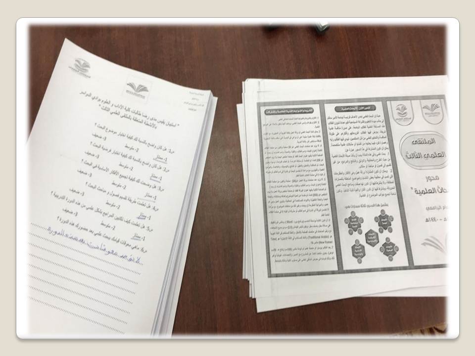 و تم توزيع منشورات على الطالبات تتضمن مسارات محور الأبحاث العلمية و الشروط و الضوابط العامة و الفنية الخاصة بالمشاركات.