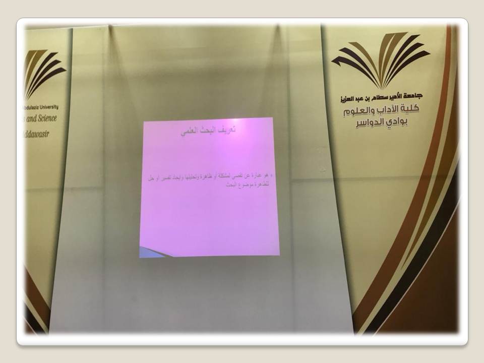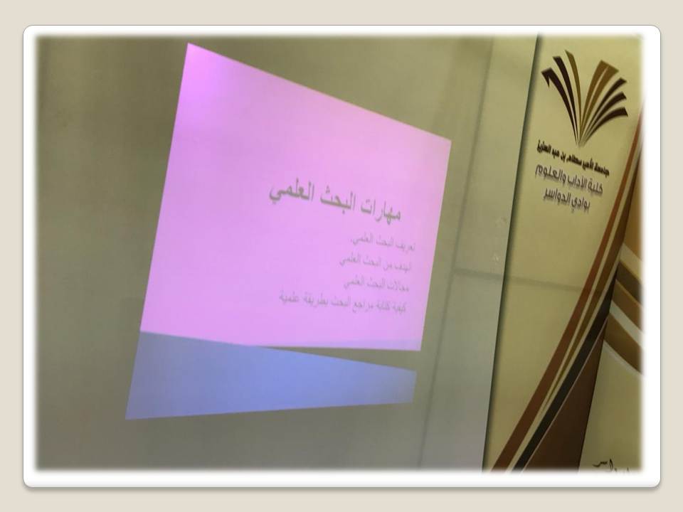 برعاية سعادة عميد كلية الآداب و العلوم بوادي الدواسر الدكتور عمر المطيري و بحضور سعادة وكيلة كلية الآداب و العلوم بوادي الدواسر الأستاذة نورة دليم و بإشراف منسقة الملتقى العلمي الثالث الأستاذة هياء شجاع عقد يوم الأحد 14/05/ 1440هـ الموافق لـ 2019/01/20 م ورشة عمل بعنوان "مهارات البحث العلمي" ضمن محور الأبحاث العلمية قدمته الدكتورة شيرين الخطيب بحضور كل من الطالبات المشاركات في الملتقى و مجموعة من أعضاء هيئة التدريس حيث عرفت الدكتورة شيرين بالبحث العلمي, أهدافه, مجالاته و كيفية كتابة مراجع البحث بطريقة علمية.