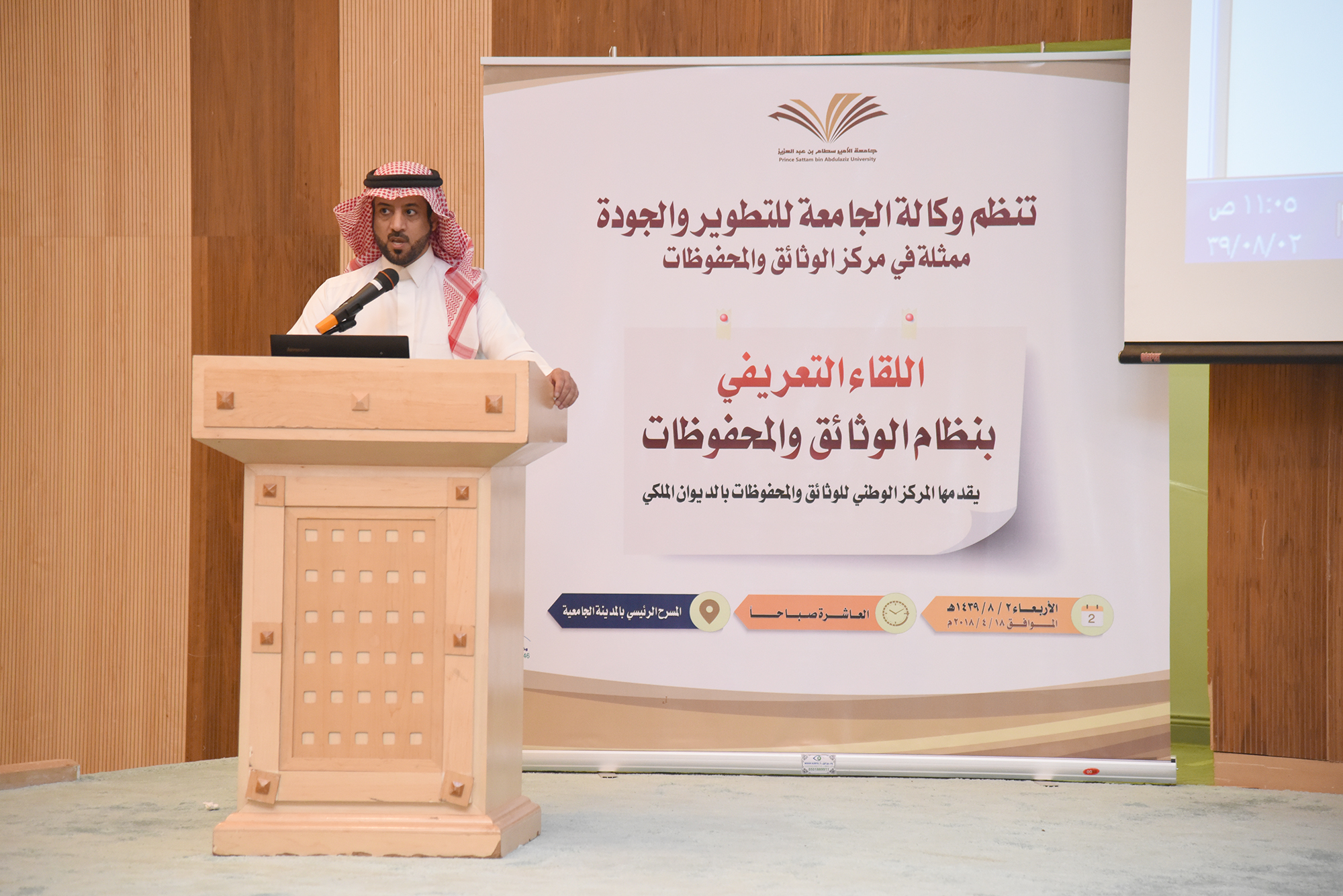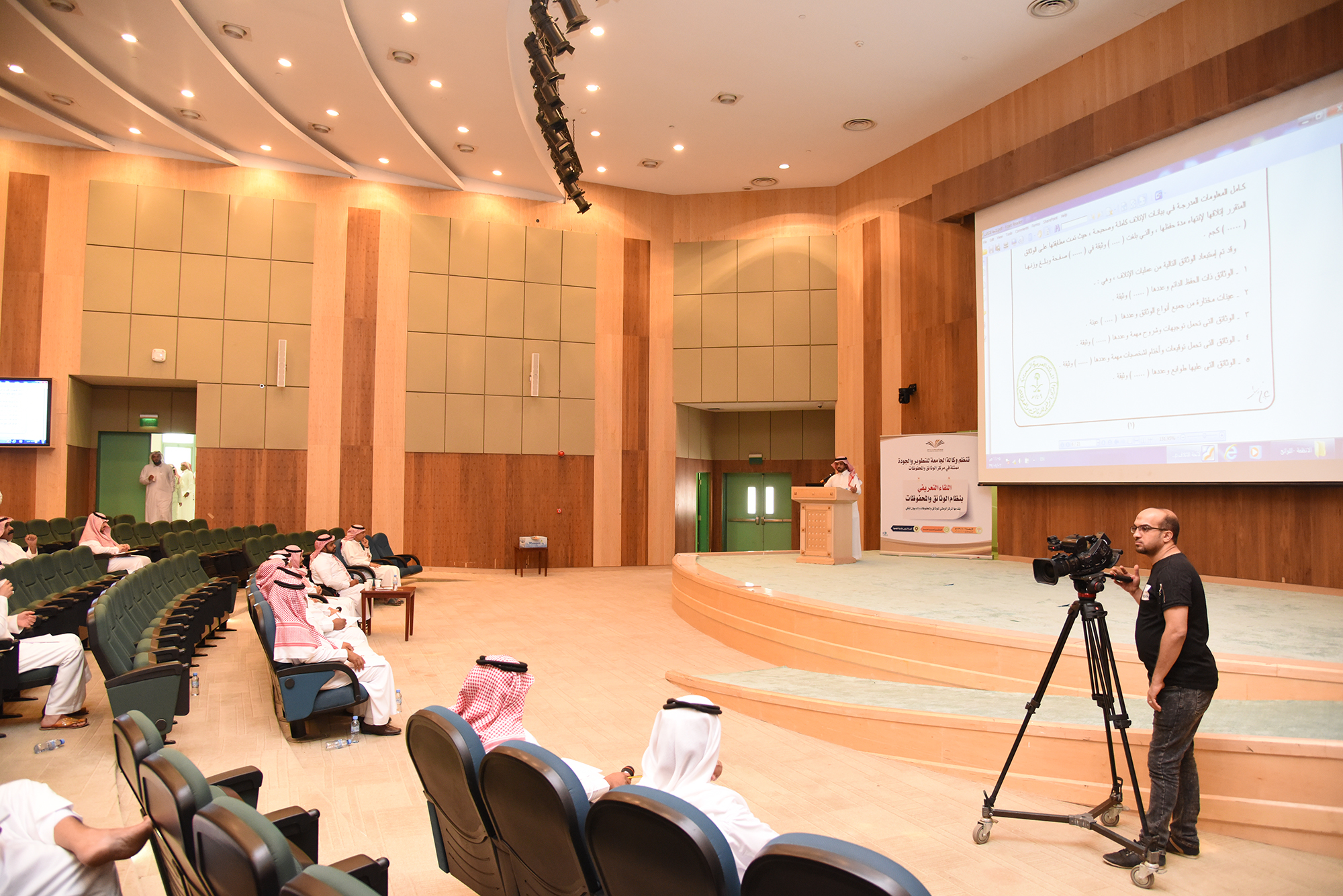 قامت وكالة الجامعة للتطوير والجودة ممثلة في مركز الوثائق والمحفوظات بإقامة ورشة عمل بعنوان ( نشر الوعي الوثائقي ) والتي قدمها المركز الوطني للوثائق والمحفوظات بالديوان الملكي ، وقد حضر الورشة سعادة وكيل الجامعة للتطوير والجودة الدكتور / ناصر بن سعد القحطاني وسعادة المشرف العام على مركز الوثائق والمحفوظات الدكتور / منصور بن زيد الخثلان ، وبحضور مدراء الإدارات وموظفي الجامعة من الرجال والنساء