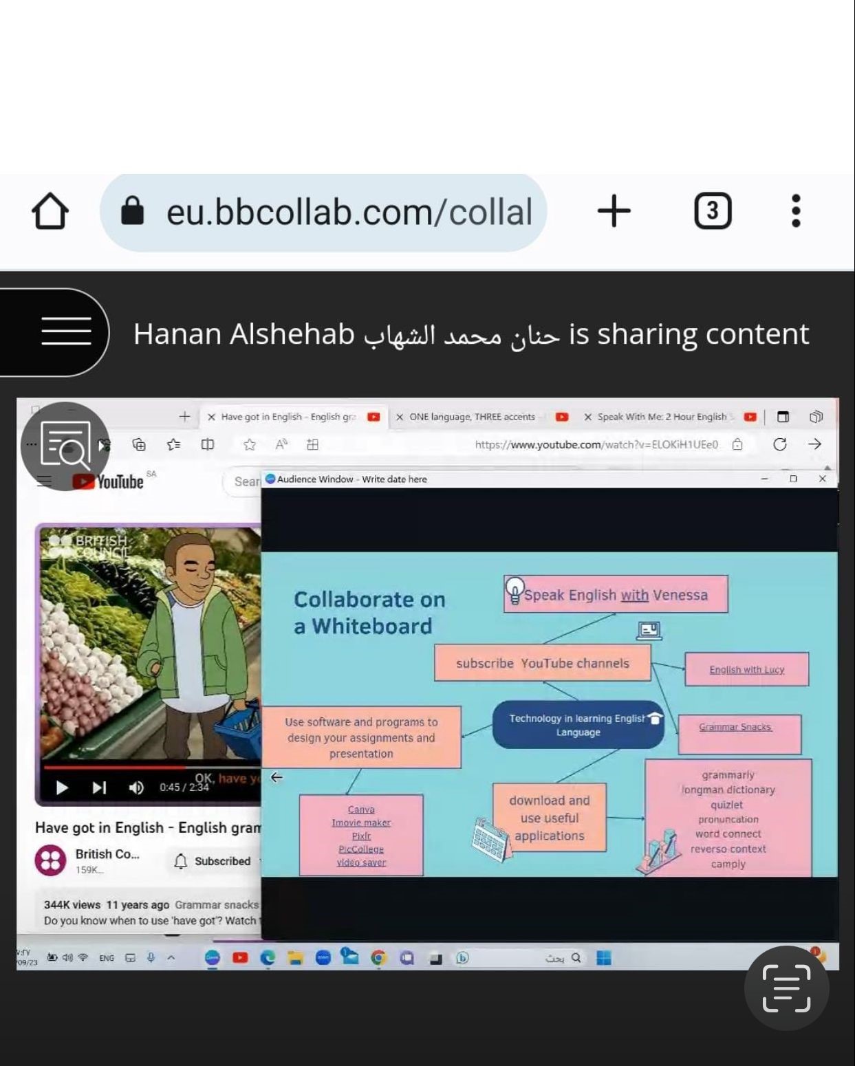 حيث قدمت الورشة المحاضر أ. حنان الشهاب، وقد كان الهدف من الورشة هو التعريف باستخدام التقنية في تعلم اللغة الانجليزية واستخدام التطبيقات والقنوات على اليوتيوب لتعلم اللغة الانجليزية وشاركت الطالبة حبيبة حجازي من طالبات قسم اللغة الإنجليزية طريقة تصميم عرض باستخدام تطبيق الكانفا.