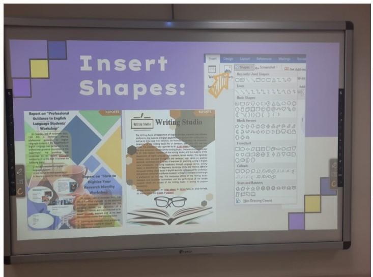 حيث تم تقديم أهمية استخدام التكنلوجيا بالتعليم وتوظيف البرامج لخدمة العملية التعليمية وأهمية الابتكار والإبداع في تقديم المعلومات المكتوبة، وقد حضرت الورشة وكيلة القسم الدكتورة ايمان النبوي ومنسقة وحدة التعليم الالكتروني بالقسم الأستاذة أسماء عبد الحليم وكان عدد الطالبات 52 طالبة.