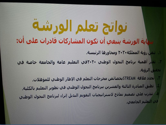 حيث تهدف الورشة إلى تنمية مهارات المشاركات في إثراء مبادرات برنامج التحول الوطني 2020 بالكلية بحيث تكون المشاركات قادرات على