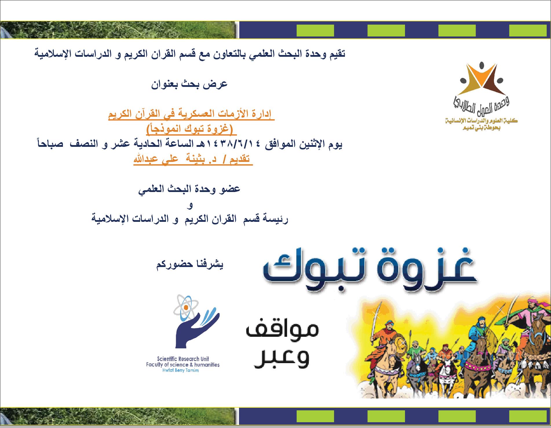 تم تنفيذ ورشة عمل بالتعاون والتنسيق بين وحدة البحث العلمي و قسم القران الكريم و الدراسات الإسلامية بكلية العلوم والدراسات الإنسانية بحوطة بني تميم بعنوان (إدارة الأزمات العسكرية في القرآن الكريم) - (غزوة تبوك أنموذجاً) من إعداد و تقديم الدكتورة/ بثينة علي فرح أستاذ مساعد بقسم القرآن الكريم والدراسات الإسلامية وذلك يوم الإثنين الموافق 14/ 6/ 1438هـ في تمام الساعة 12 ظهرًا بمسرح الكلية. تهدف الورشة إلى التأصيل في إطار الشريعة الإسلامية والاستفادة من قيادة الرسول صلى الله عليه وسلم والقدرة على إدارة الأزمة في حينها. كما تناولت د.بثينة الحديث عن إدارة الأزمات في عصرنا الحالي. نالت الورشة استحسان الحضور ورغبة في عرض المزيد من هذه النوعية من الورش للاستفادة وتنمية الأفكار.