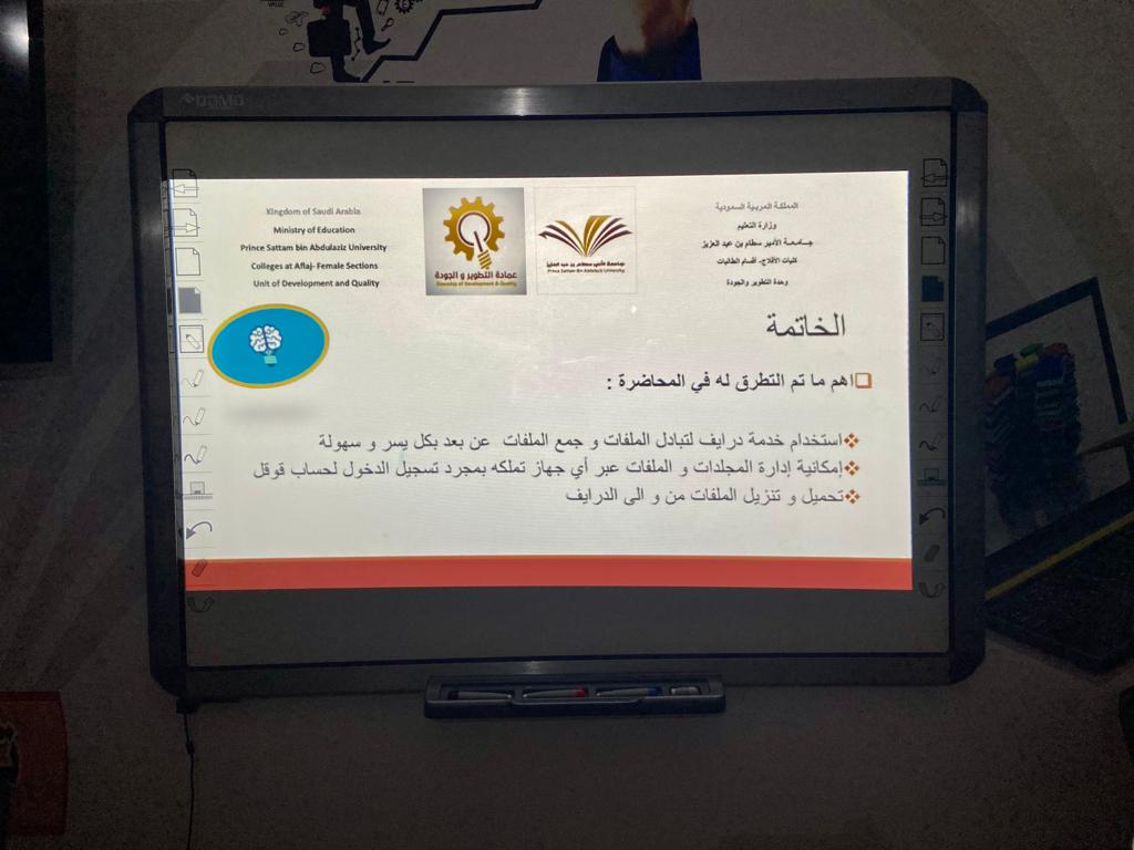 أقامت إدارة الموارد البشرية – شعبة الموظفات – بالتعاون مع قسم علوم الحاسب بكلية العلوم والدراسات الإنسانية بالأفلاج (أقسام الطالبات ) يوم الثلاثاء والأربعاء بأقسام الكلية الأدبية والعلمية ورشة عمل بعنوان ( google Drive ) قدمتها أ/ داليا عبود العبود .