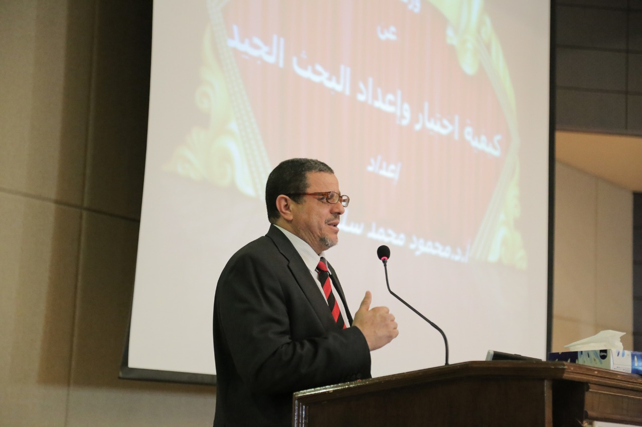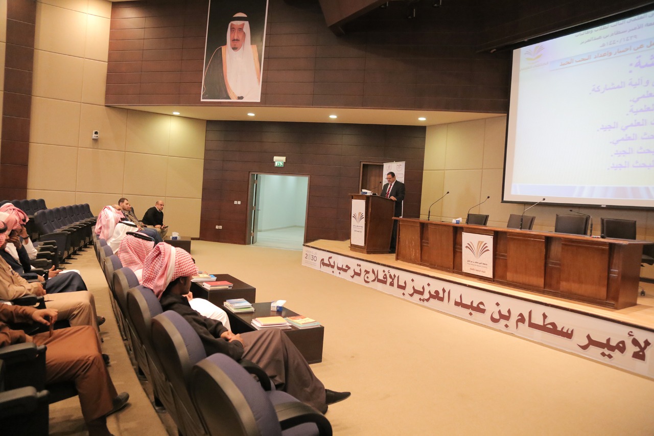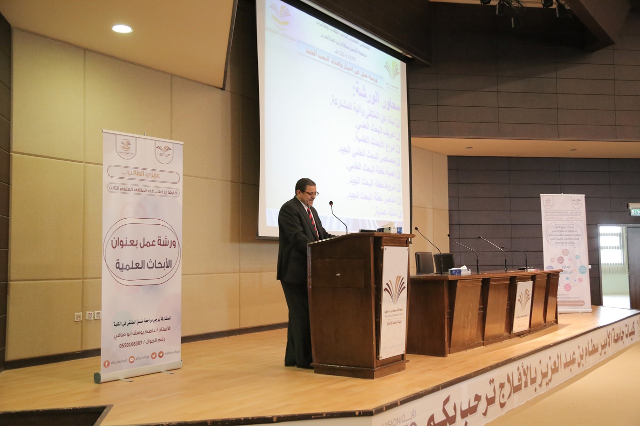 ضمن فعاليات الملتقى العلمي الثالث بكليات الجامعة في محافظة الأفلاج ، أقامت لجنة الملتقى العلمي يوم الأحد 1440/5/15 هـ ورشة عمل بعنوان" كيفية اختيار وإعداد البحث العلمي الجيد" . وغطت الورشة محور الأبحاث العلمية ، كما تطرقت إلى كيفية اختيار المواضيع البحثية وشروط البحث العلمي الجيد. وفي نهاية الورشة أجاب الاستاذ الدكتور محمود محمد سليم معد الورشة ، على اسئلة واستفسارات الطلاب ، وأعطى نبذة عن الملتقى العلمي وكيفية مشاركة الطلاب في محاور الملتقى . وحضر الورشة عدد من طلاب الأقسام العلمية وأعضاء لجنة الملتقى العلمي بالأفلاج .