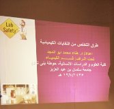أقام قسم الكيمياء والوحدة البحثية لتقنية النانو بكلية العلوم والدراسات الإنسانية بحوطة بني تميم ورشة عمل بعنوان "كيفية التخلص من النفايات الكيميائية بالمختبرات" تحت اشراف أ. د. عواطف بنت أحمد هندي عميدة الكلية واعداد د. هناء محمد أبو المجد وبمشاركة طالبات القسم وذلك في مدرسة الحلوة الثانوية وقد حضر الورشة معلمات الكيمياء وموجهات العلوم والكيمياء بمحافظتي حوطة بنى تميم والحريق.