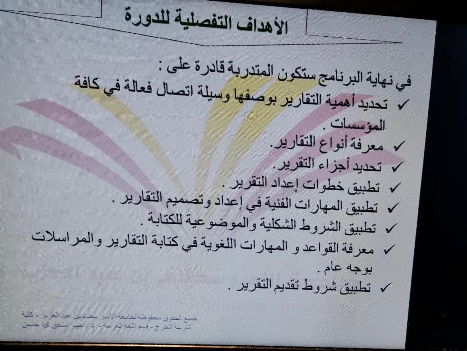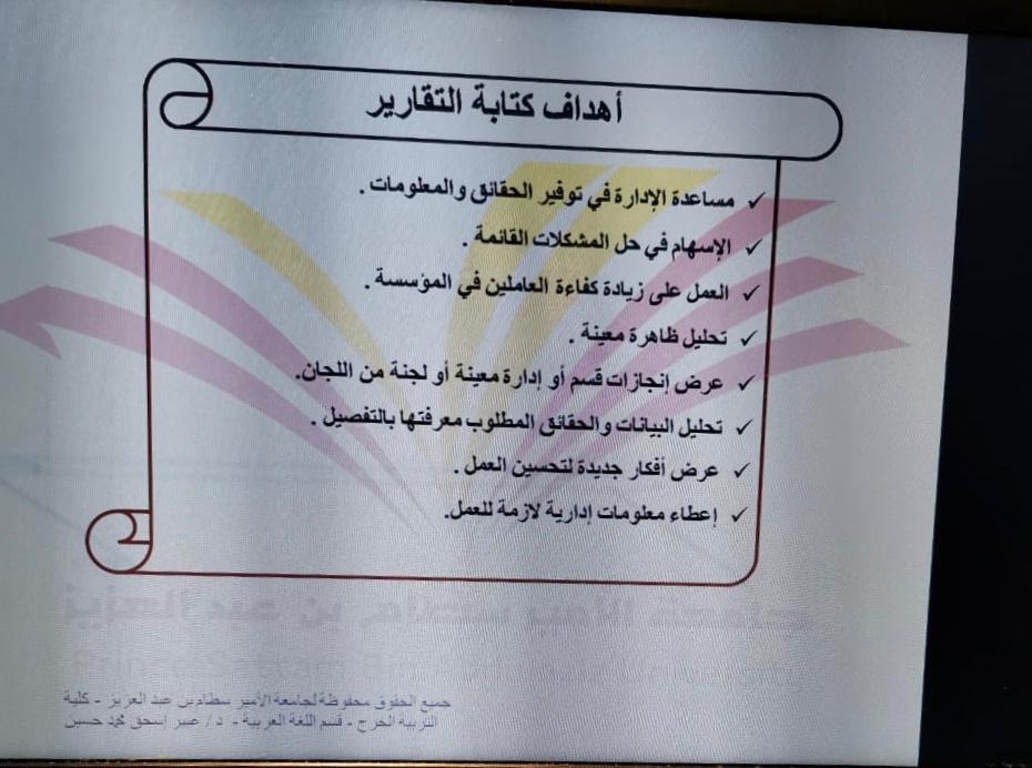 أقام قسم اللغة العربية تحت مظلة وحدة العمل الطلابي ورشة عمل بعنوان: (كيفية كتابة التقارير الفعالة).للدكتورة/ عبير إسحق,يوم الأربعاء الموافق 30-3-1441هـ,بقاعة التدريب في تمام الساعة العاشرة. وتهدف الورشة لتنمية معارف ومهارات المتدربات لإعداد وتقديم التقارير الفعالة .ومعرفة أنواع وأجزاء وخطوات كتابة التقارير.وقد بلغ عدد الحضور 13 طالبة.