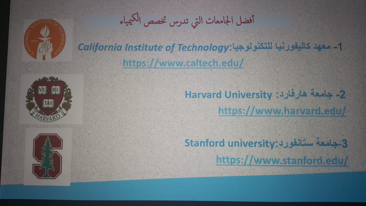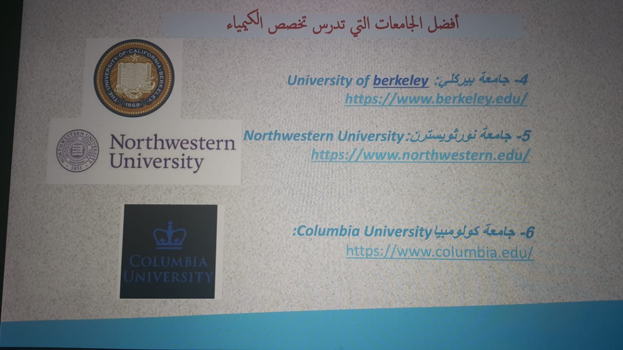 وفي نهاية الورشة تم ذكر أمثلة على أفضل الجامعات التي تدرس وتقدم منح للطالبات في مجال الكيمياء.