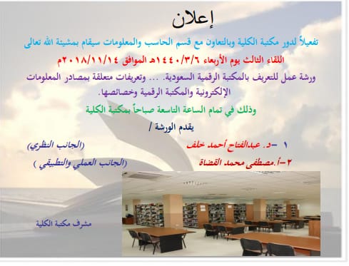 تحت رعاية عميد الكلية الدكتور / سلمان بن صاهود العتيبي ، نظمت مكتبة الكلية بالتعاون مع قسم الحاسب والمعلومات ورشة عمل للتعريف بالمكتبة الرقمية السعودية ....وتعريفات متعلقة بمصادر المعلومات الإلكترونية والمكتبة الرقمية وخصائصها وذلك يوم الأربعاء:6/3/1440هـ الموافق 14/11/2018م بمكتبة الكلية