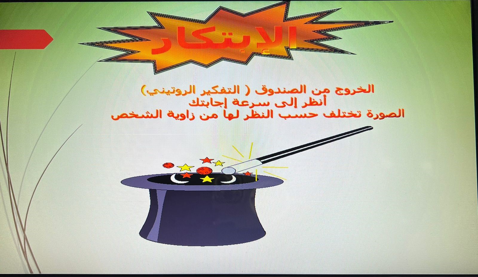 وقد تناولت الورشة أهمية الابتكار أو الإبداع في حياتنا، فالابتكار الرفيع والأصالة في الإنتاج ضرورة قصوى في عصرنا الحاضر ويرجع ذلك إلى دور المستويات العليا من التفكير والابتكار في تغيير عالم الواقع بما يتلائم مع تطور المجتمع وتحتوي هذه الورشة على معلومات كافية عن مفهوم الابتكار ومستويات ومراحل العملية الابتكارية والإبداعية والعوامل التي تكون القدرة على التفكير الإبداعي وأهمية التفكير الابتكاري ومجالات الابتكار والإبداع وسمات الشخصية المبتكرة والمبدعة وأدوات ومخرجات الابتكار والإبداع.