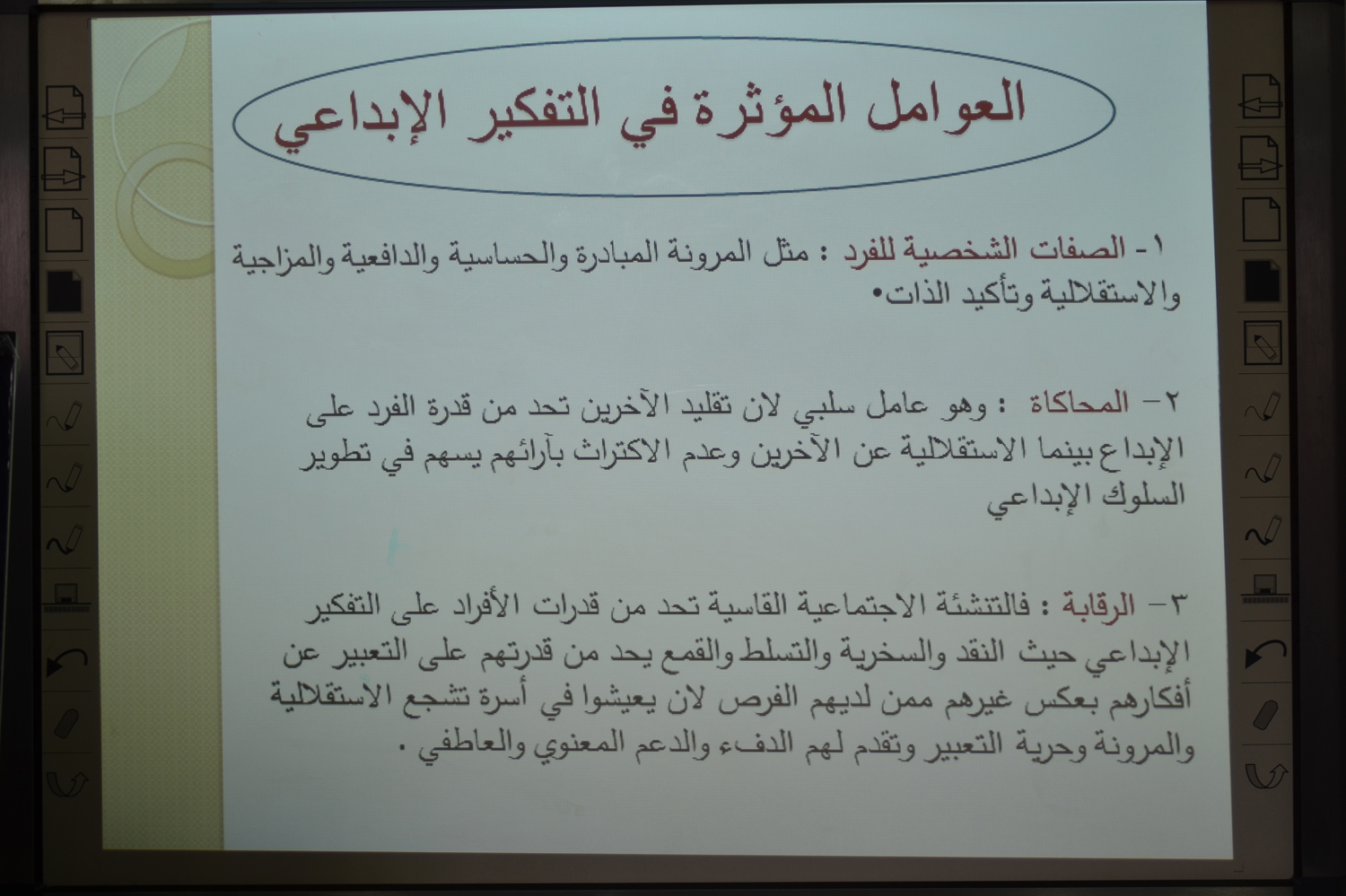 نظمت وحدة التدريب والتنمية المهنية بكلية العلوم والدراسات الإنسانية بالأفلاج يوم الثلاثاء ١٤٤٠/٢/٧ هـ الساعة الحادية عشرة و النصف بقاعة التدريب ورشة عمل بعنوان " مهارات التفكير الإبداعي " قدمتها عضو هيئة التدريس الدكتورة نهاد عبدالمطلب شامة ، افتتحتها بأرقى سمة إتسم بها الأنسان ألا وهي سمة العقل التي ميزنا الله بها عن بقية المخلوقات فبالعقل نفكر ونبدع ، فتناولت التفكير ومعناه وكذاك التفكير الإبداعي و خصائصه و ظواهره ومقوماته ونظرياته و استراتيجياته وطرقه التي تساعد على إخراج ما لدى الإنسان من إبداع مكبوت ، كما تطرقت إلى برامج لعلماء في تطوير التفكير الإبداعي واستخراجه كهميلتون وتورانس ، بعدها انتقلت إلى ما يهلك التفكير الإبداعي و يكاد أن يقضي عليه كالتهديد و الاجهاد و تعلم العجز ، كما ذكرت العوامل المؤثرة في التفكير الإبداعي .