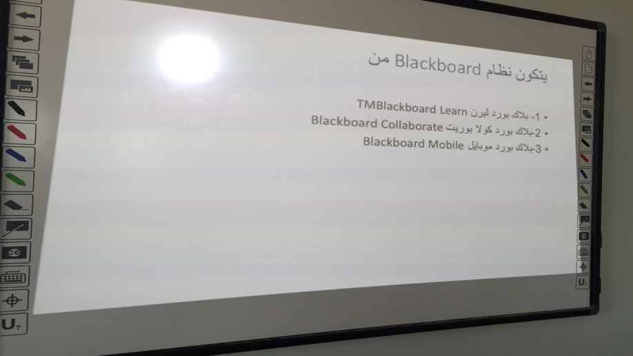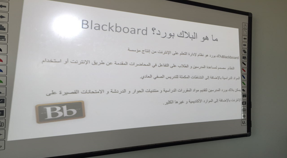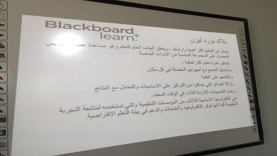 كما تم تدريبهن على طريقة تسليم الواجبات والاختبارات على النظام وإعطاء معلومات عن أدوات النظام المختلفة وطريقة استخدامها ومعلومات عن مركز التقديرات بالإضافة إلي تقديم شرح لنظام الكولابريت و شرح مفصل لخدمات البلاك بورد على الجوال.
