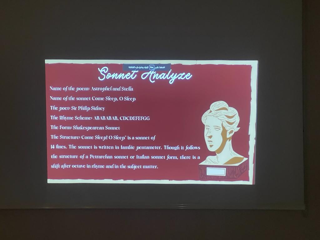 دارت محاور الورشة حول تدريب الطالبات على قراءة القصيدة باللغة الإنجليزية وفهمها ، وكذلك التعرف على كاتب القصيدة ، وتحليل مفردات القصيدة لمعرفة محتواها الأدبي ، وأيضا كيفية التعرف على الإيقاع الفني للقصيدة .