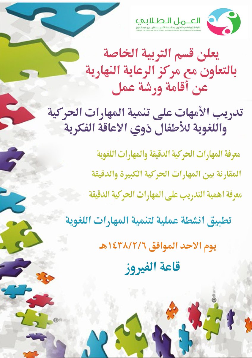 قدم قسم التربية الخاصة بكلية التربية بالخرج يوم الأحد الموافق1438/2/6هـ ورشة تدريب للأمهات (لتنمية المهارات الحركية واللغوية للأطفال ذوي الإعاقة الفكرية)؛ حيث استقطبت أمهات وأطفال الطلبة ذوي الإعاقة الفكرية ومعلمات مركز السيح للرعاية النهارية، واستهدفت الورشة بشكل عام تدريب طالبات مسار التربية الفكرية، والمعلمات والأمهات على كيفية تدريب المعوقين فكريًّا على أنشطة المتنوعة الحركية الدقيقة، مما ينمي لديهم إتقان الإمساك بالقلم، والعناية بالذات .