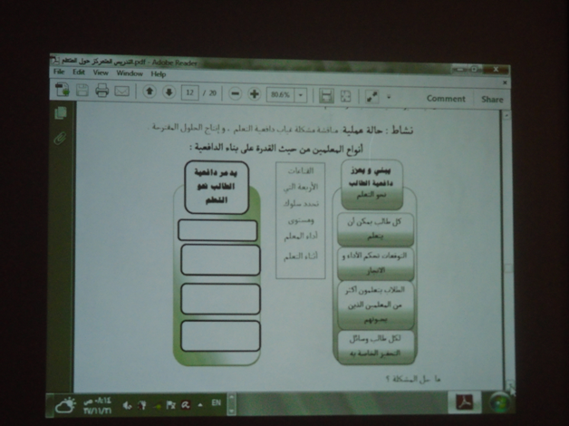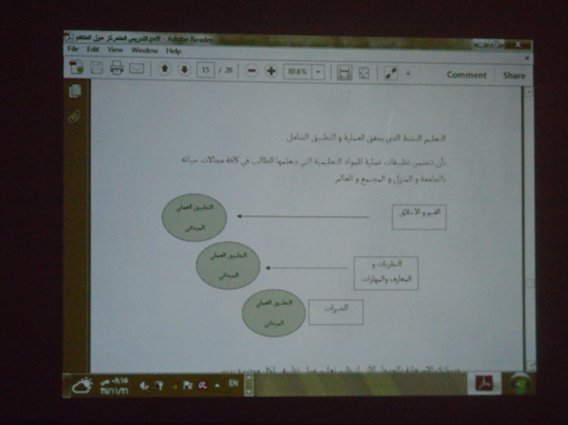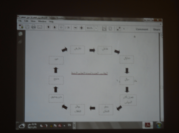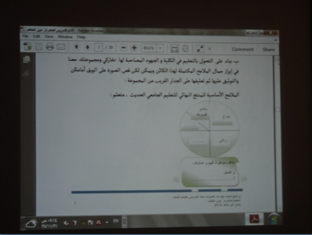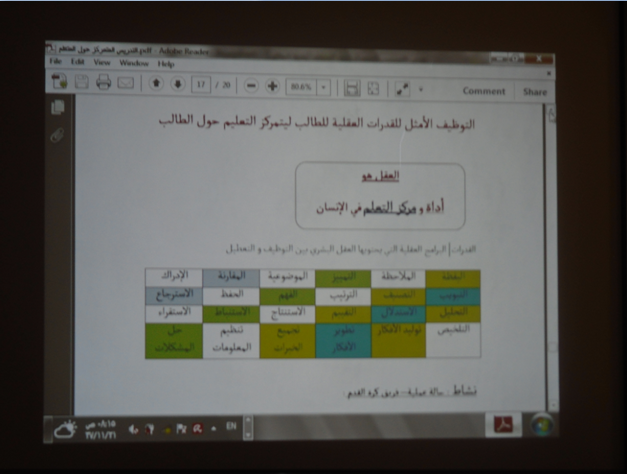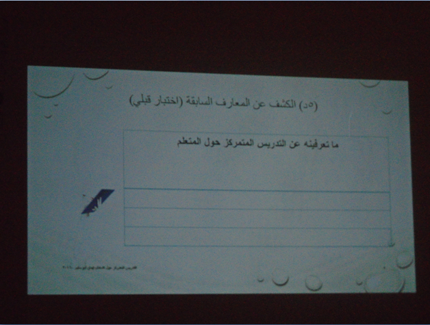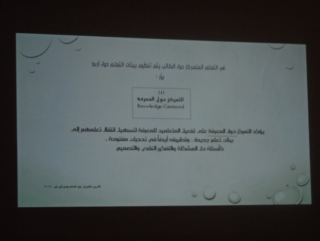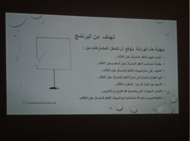 ضمن برنامج تنمية مهارات عضوات هيئة التدريس الذي تنفذه وكالة الجامعة للشؤون التعليمية والأكاديمية ممثلة بالوحدة الإشرافية على كليات البنات بهدف تطوير المهارات التدريبية لدى عضوات هيئة التدريس ، فقد تم في يوم الأربعاء الموافق 21 /11/1437هـ تفعيل ورشة تدريبية بعنوان" التدريس المتركز حول المتعلم " من إعداد وتقديم د.إيمان حسين أبو سليم الأستاذ المساعد في المناهج ، بقاعة الخنساء وقد استمرت الورشة لمدة خمس ساعات من الساعة الثامنة والنصف صباحاً حتى الساعة الواحدة والنصف ظهراً . حيث يعد مشروع تطوير إستراتيجيات وطرق التعلم المتمركز حول الطالب الذي تبنته وزارة التعليم العالي في المملكة منذ عام 1429- 1430هـ كأحد المشاريع المنبثقة عن مبادرة تنمية الإبداع والتميز لدى أعضاء هيئة التدريس ، وتبنتها جامعات متعددة في المملكة ، باعتبار طالب هذا العصر يعد ركنا أساسيا في العملية التعليمية فهو يملك إمكانات متنوعة تفرض على كل عضو هيئة تدريس إفساح المجال له للتعبير عنها في إطار ممارسات مخططة ، والورشة تهدف بشكل عام إلى تحديد مفهوم التعليم المتمركز حول الطالب – مقارنة خصائص التعلم المتمركز حول المعلم وحول الطالب – التعرف على استراتيجيات التعلم المتمركز حول الطالب – فهم العوامل المؤثرة في نجاح التعلم المتمركز حول الطالب – التمييز بين أدوار كل من :المعلم والطالب – اكتساب المهارات التي يتضمنها هذا النوع من التعلم – تخطيط لدروس متنوعة باستخدام استراتيجيات التعلم المتمركز حول الطالب .