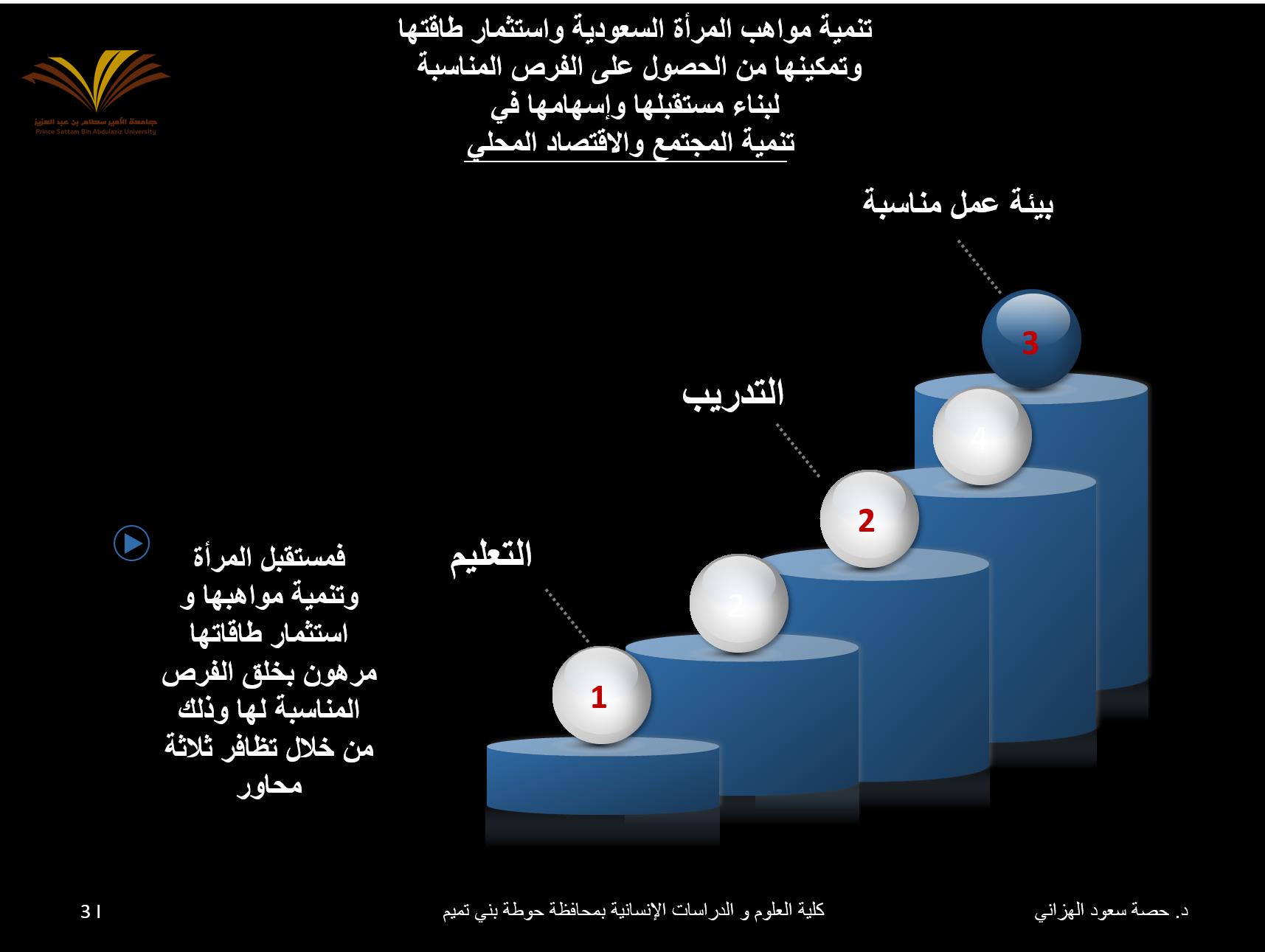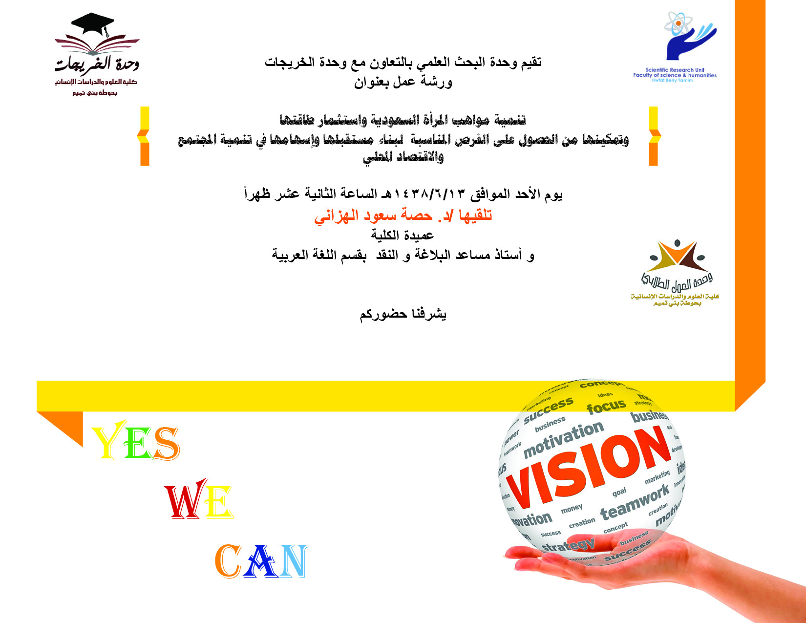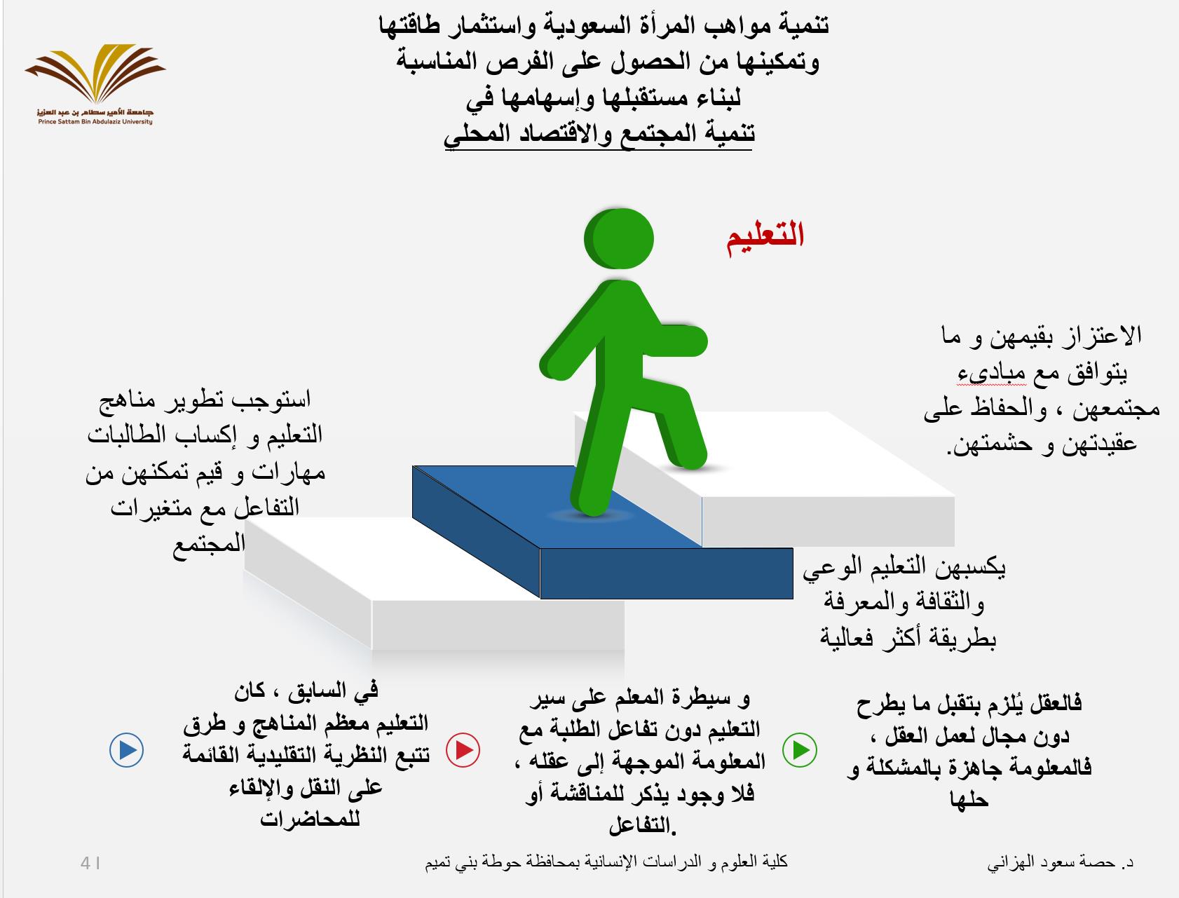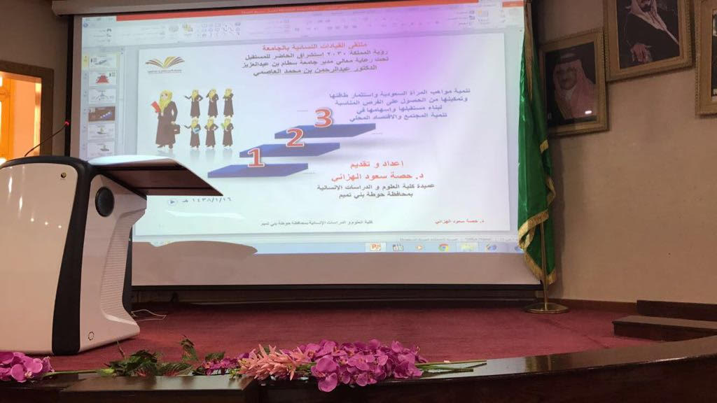 تم تنفيذ ورشة عمل بعنوان (تنمية مواهب المرأة السعودية) بالتعاون والتنسيق بين وحدة البحث العلمي ووحدة الخريجات بكلية العلوم والدراسات الإنسانية بحوطة بني تميم وذلك يوم الأحد الموافق 13/ 6/ 1438هـ بمسرح الكلية في تمام الساعة الثانية عشر ظهرًا. الورشة من تقديم عميدة الكلية الدكتورة حصة بنت سعود الهزاني أستاذ البلاغة والنقد المساعد بقسم اللغة العربية. تهدف الورشة إلى تنمية مواهب المرأة السعودية واستثمار طاقتها وتمكينها من الحصول على الفرص المناسبة لبناء مستقبلها وإسهامها في تنمية المجتمع والاقتصاد المحلي. ومن أبرز المحاور التي تناولتها الدكتورة حصة هي مستقبل المرأة وتنمية مواهبها واستثمار طاقاتها وخلق الفرص المناسبة لها وذلك من خلال تظافر ثلاثة محاور هي التعليم والتدريب وبيئة عمل مناسبة وانتهت إلى أن تنمية مواهب المرأة السعودية لن يتحقق إلا بتوفير بيئة تعليمية يساندها التدريب والتأهيل ثم تخوض بعدها سوق العمل باقتدار وبذلك تسهم في بناء المجتمع والاقتصاد المحلي. شهدت الورشة حضور عدد من منسوبات وطالبات وكذلك خريجات الكلية كما تخلل الورشة مناقشات ومقترحات لبعض المشاريع الصغيرة وكيفية مواجهة الصعوبات والتحديات وإيجاد الحلول المناسبة. وقد صاحب الورشة ركن يحتوي على منشورات وكتيبات تعريفية للخريجات والطالبات بالبرامج المقدمة من صندوق الموارد البشرية (هدف) للتوظيف مثل (طاقات) البوابة الوطنية للعمل وغيرها من البرامج المقدمة.
