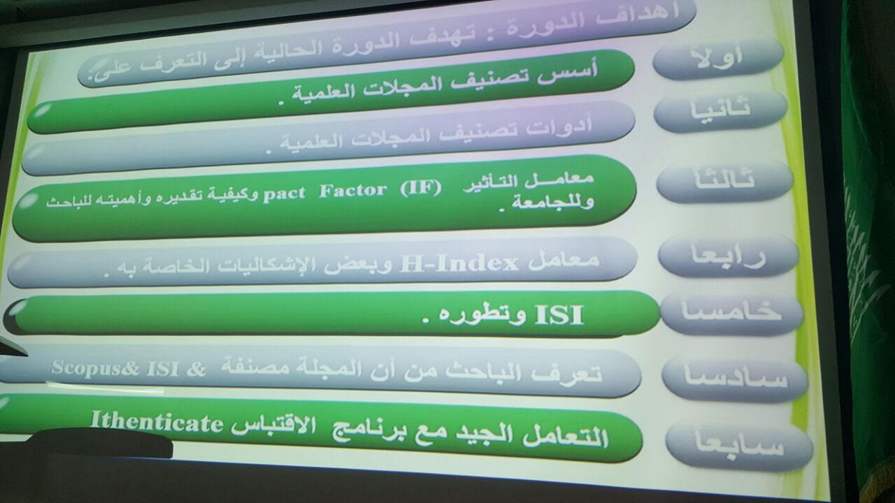 أقامت وحدة البحث العلمي بكلية العلوم والدراسات الإنسانية بحوطة بني تميم متمثلًا بمشرفته أ. باتعة الجعفري بالتعاون مع عمادة البحث العلمي بالجامعة يوم الخميس الموافق 2 /3 /1438هـ ورشة عمل بعنوان: تصنيف المجلات العلمية Scientific Journals Ranking بمسرح الكلية في تمام الساعة العاشرة صباحًا قدمها: د/ طارق توفيق الخطيب الأستاذ المساعد بكلية إدارة الأعمال بالخرج والأستاذ/ مظفر عباس من عمادة البحث العلمي. وقد هدفت الدورة إلى التعرف على: