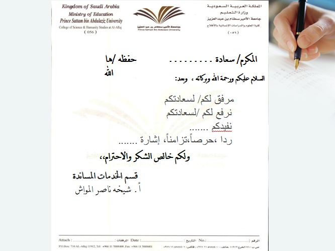 نظمت وحدة التطوير والجودة متمثلة في التدريب و التطوير المهني بكليات الأفلاج ( أقسام الطالبات ) عبر منصة Zoom يوم الثلاثاء 1442/4/2 هـ في تمام الساعة الثامنة مساءاً ورشة عمل بعنوان ( تطوير مهارات كتابة الخطابات الرسمية ) قدمتها أ/ شيخة ناصر المواش , احتوت على تعريف الخطابات وشروطها , وكذلك الأصول التي يجب مراعاتها عند كتابة الخطاب , و معايير الحكم على مستوى جودة الخطاب , و اختتمتها بأنواع الخطابات .