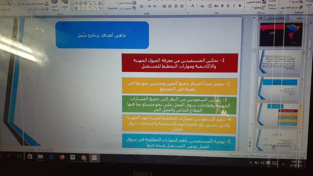في يوم الخميس الموافق 4/3/2021م عبر منصة زووم وضمن فعاليات وحدة الارشاد المهني بوحدة الخريجات بكلية التربية بالخرج تم تنظيم ورشة عمل عن قياس الميول والقدرات المهنية عن طريق برنامج سبل وذلك بتعريف الطالبات عن برنامج سُبل وهي أحدى مبادرات صندوق تنمية الموارد البشرية (هدف) للتعرف على الميول المهنية للخريجات والمتوقع تخرجهن بكلية التربية وأهميته في تحديد المسار المستقبلي لهن والوقوف على خطوات التسجيل في البرنامج والتطرق الى بعض البرامج المصاحبة ضمن مبادرات (هدف) مثل التسجيل في برامج طاقات والتعرف على امتيازات الالتحاق بهذه البرامج و تم ذلك بحضور (78طالبة) من الخريجات والمتوقع تخرجهن وقد لاقت الورشة قبول واستحسان الحاضرات بشكل كبير.
