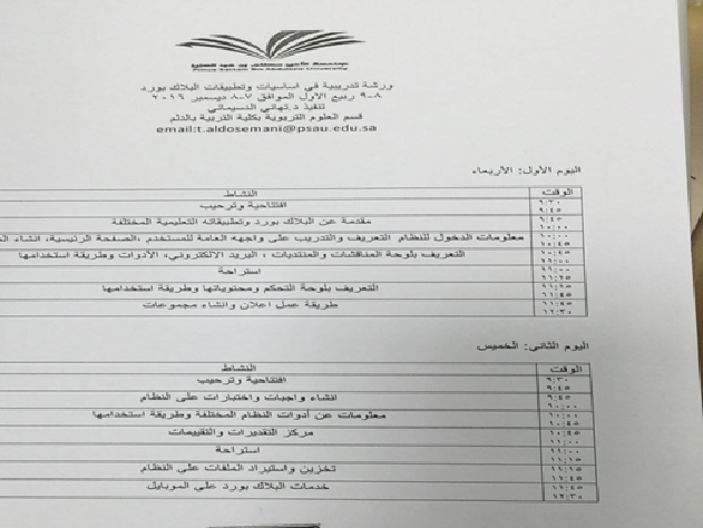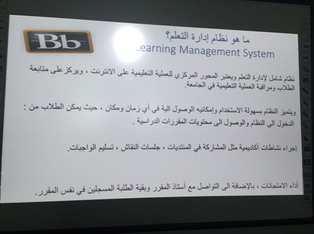 وقد استهدفت الورشة أعضاء هيئة التدريس ، وتهدف إلى تعريف وتدريب أعضاء هيئة التدريس على كيفية استخدام نظام إدارة التعلم الالكتروني البلاك بورد بملحقاته مثل نظام الليرنوالكولابوريت (learn and collaborate)والموبايل (mobile) - تدريب أعضاء هيئة التدريس على أدوات وتطبيقات النظام المختلفة باللغة العربية والإنجليزية.