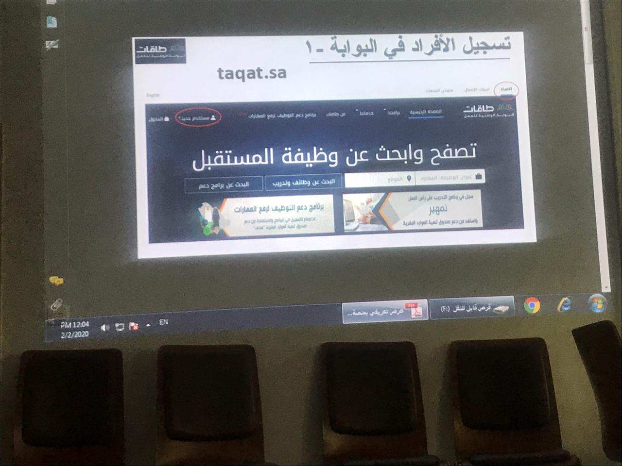 وتم التأكيد على ضرورة وأهمية التسجيل لمساعدة الخريجات للحصول على فرص وظيفية مناسبة . وقد لاقت الورشة ترحيب من الجميع وبعد شرح خطوات التسجيل قام جميع الحضور بالتسجيل بنجاح.