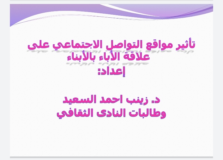 قدمت د. زينب السعيد مشرفة النادي الثقافي تحت رعاية الدكتورة رفعة دحيم وكيلة كلية الآداب والعلوم بوادي الدواسر وضمن نشاطات الأندية ورشة بعنوان تأثير مواقع التواصل الاجتماعي علي علاقة الآباء والأبناء